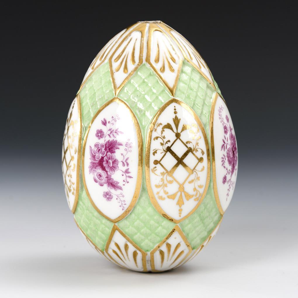 1x St. Petersburg, ungemarkt, 1900-1917: mit roten Blumen und Blattband bemalt. / 1x wohl Russland, ungemarkt, 19./20. Jh.: im Stil des Biedermeier gearbeitetes Ei mit grün staffiertem Diamantrelief sowie Ovalmedaillons mit purpurfarbenem Blumendekor und Goldmalerei.
