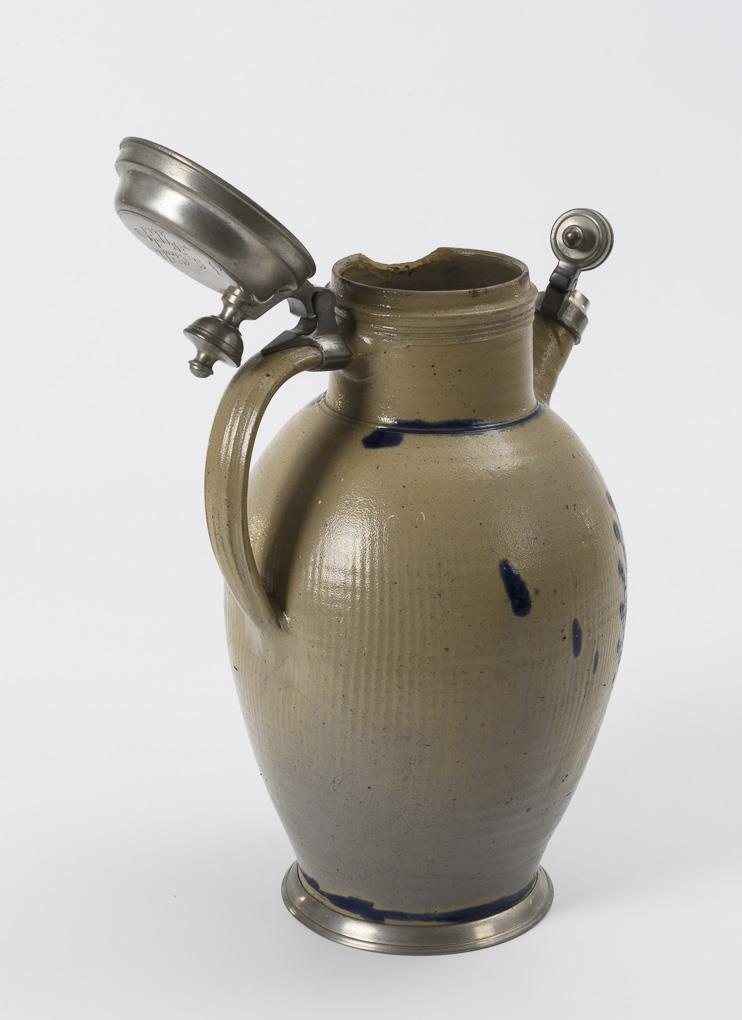 Ovoide Form mit zylindrischer Tülle und Bandhenkel, schauseitig eine bekrönte Ovalreserve zwischen gefiedertem Blattwerk. Zinndeckel mit Urnendrücker, graviert "J. G. Gruhle v. Poppitz 1811". Tüllenaufsatz lose, feiner Mündungsriss, durch Zinndeckel verdeckter Randausbruch.