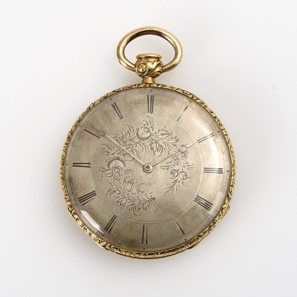 Ungemarktes Messingwerk mit Zylinderhemmung und Schlüsselaufzug, Werk läuft. Repetition mit Drücker auf dem Bügel, nicht funktionstüchtig. Versilbertes Zifferblatt mit floralen Gravuren, römischen Zahlen und Breguet-Zeigern.