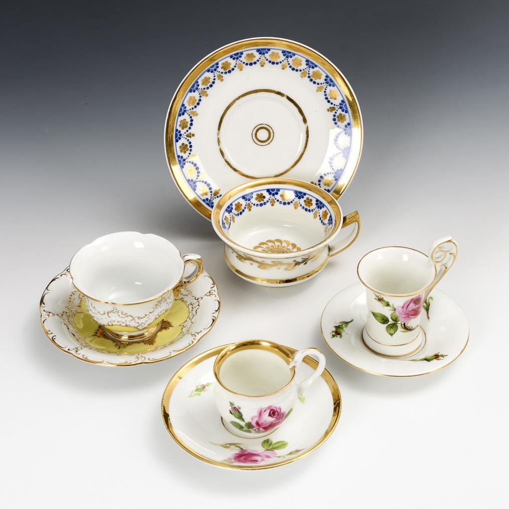 Polychrom bemalt, goldstaffiert; 1x Malerei über Vordruck. H Tassen 5-8 cm, Ø originale Untertassen 10,5-15 cm.