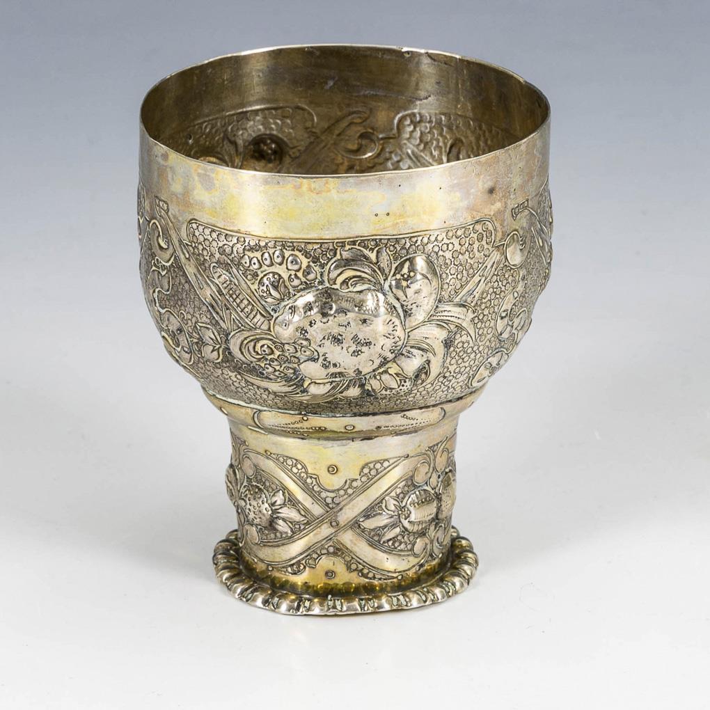 Reich reliefierter, kleiner Historismus-Becher mit unterseitiger Wappengravur. Restvergoldet.