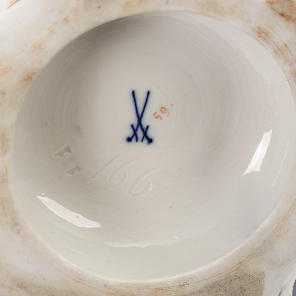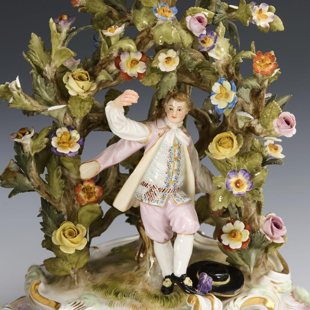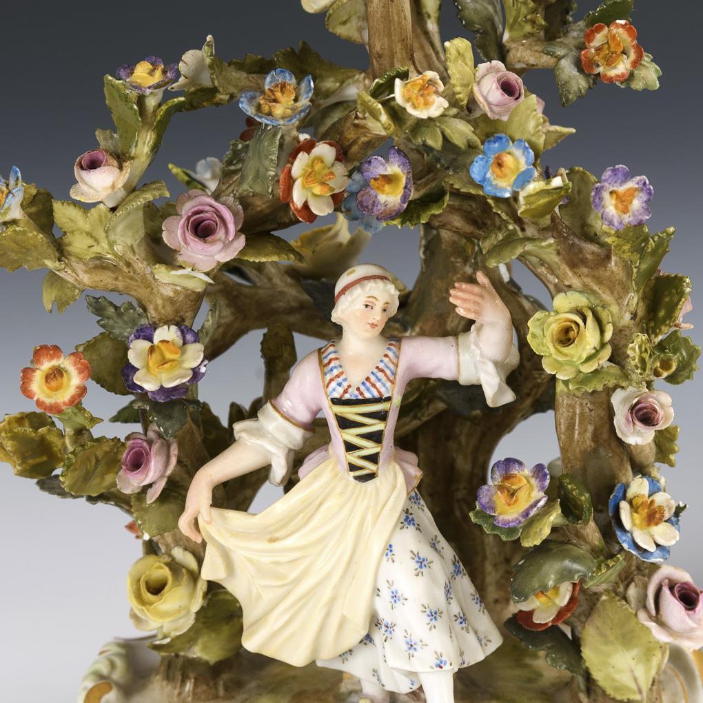 Auf einem Rocaillesockel platzierte Blumenlaube mit Kerzentülle, in der Laube eine tanzende Frau bzw. ein tanzender junger Mann stehend. Bestoßungen am Belag, einige Blätter und Blüten und 1x Stämme restauriert.