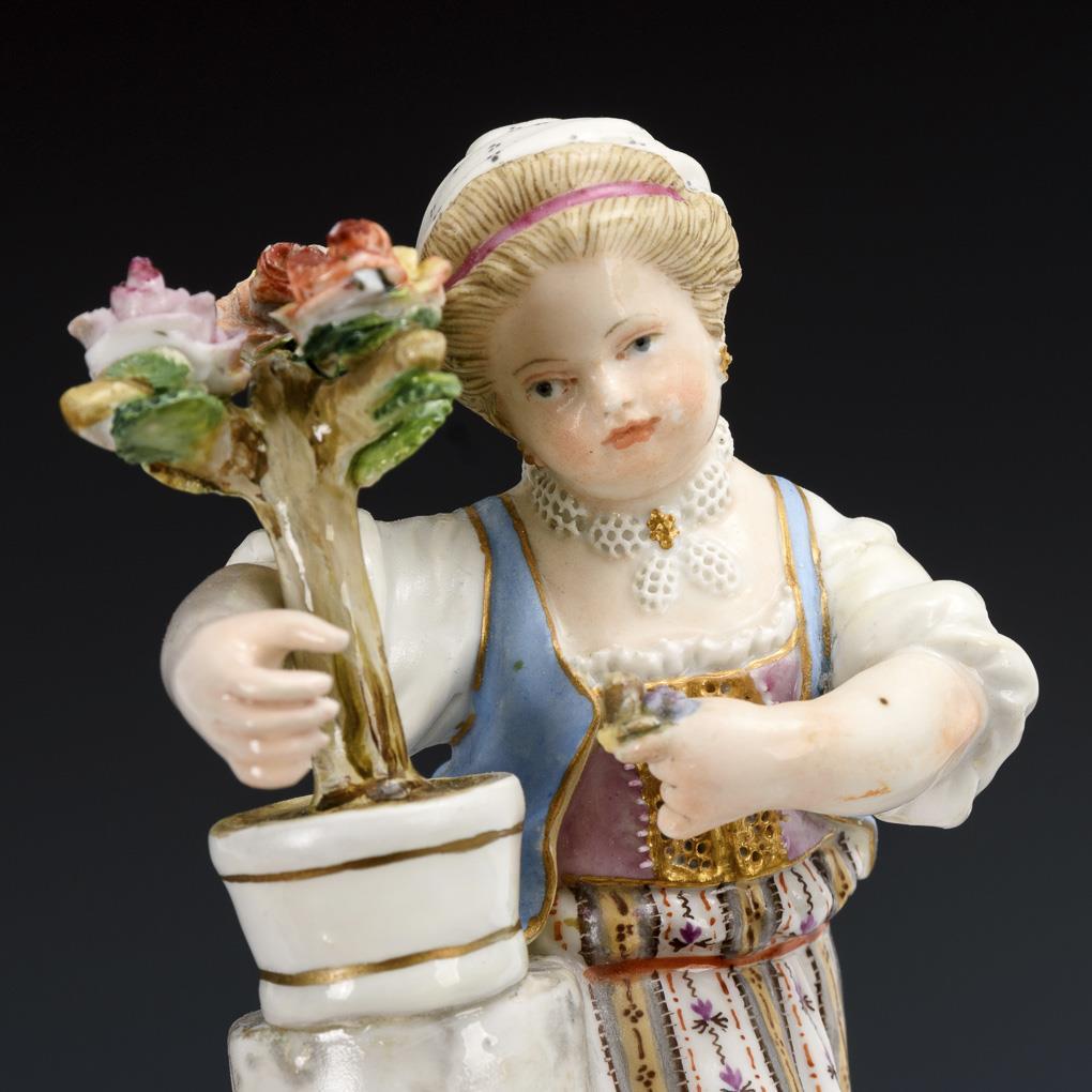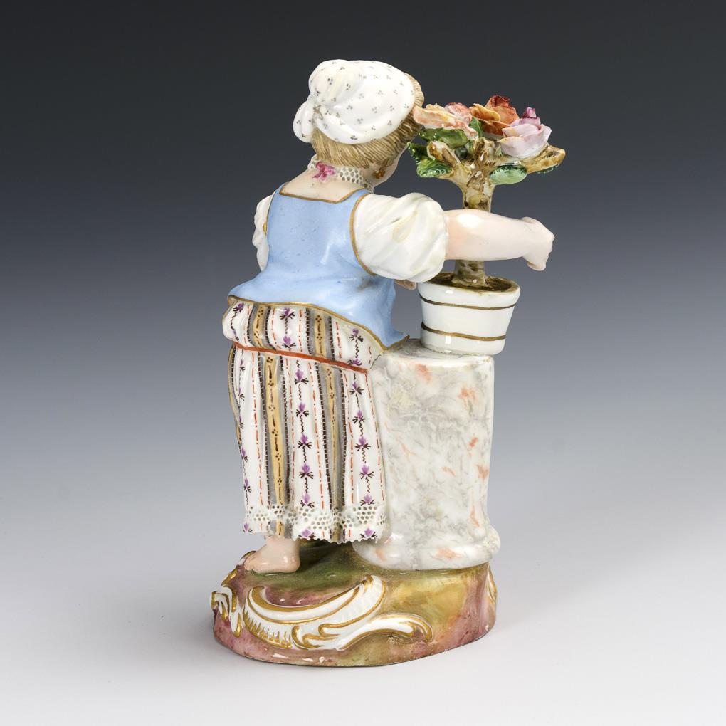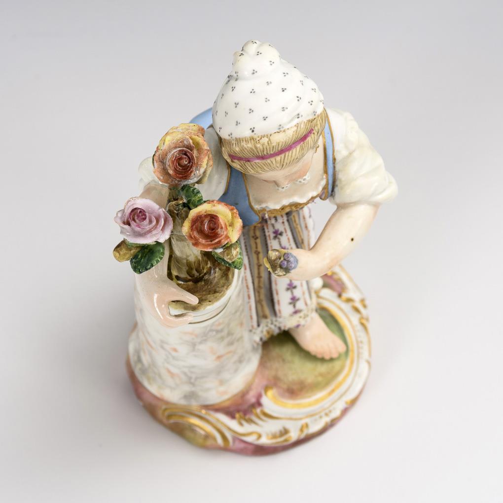 An einem Säulenstumpf mit Rosenstock stehendes Gärtnerkind. Bestoßung am Sockelrand, Rosenstock und rechter Arm restauriert, Spitze etwas bestoßen.