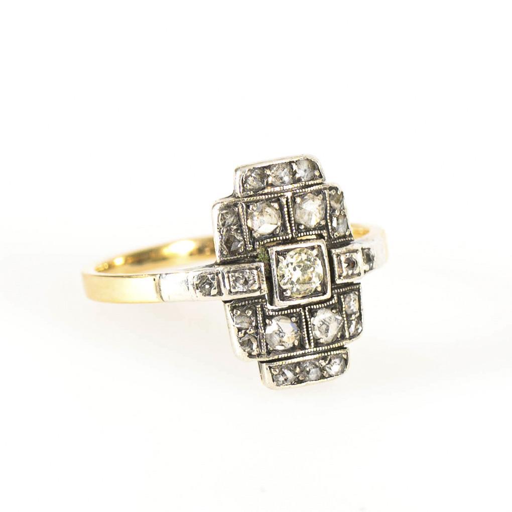 Art-déco-Ring mit Altschliff-Brillant und Diamantrosen.
