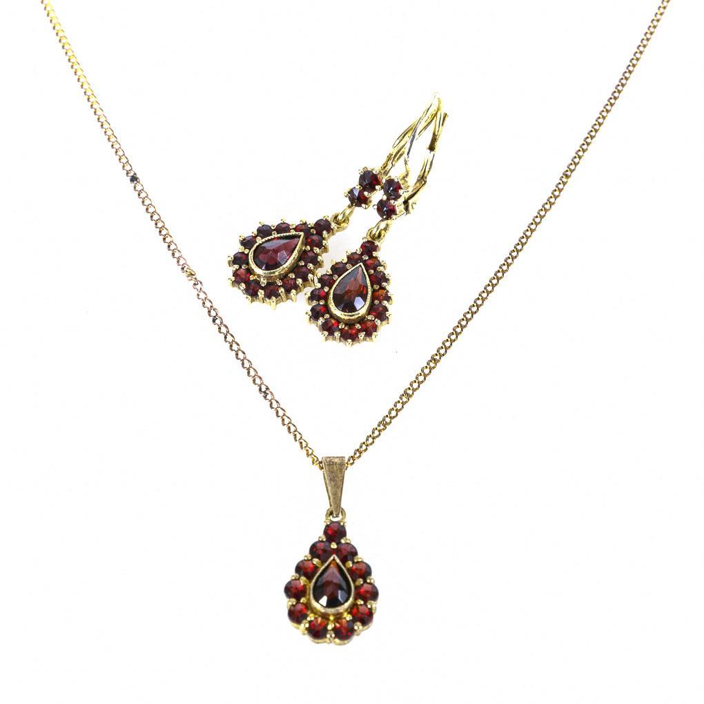 Anhänger an Kette und Ohrhängerpaar mit Granaten.