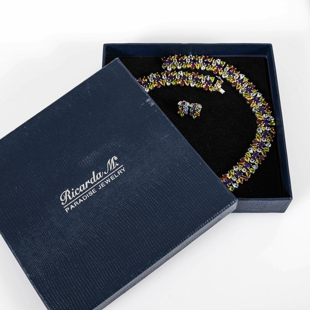 Designer-Halskette und Ohrsteckerpaar mit verschiedenen Farbsteinen.