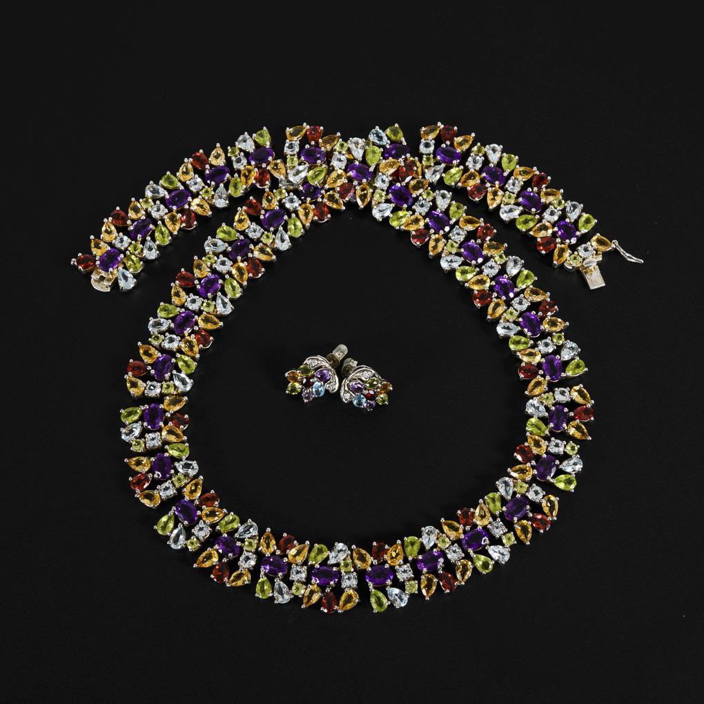 Breite Gliederkette mit zahlreichen krappengefassten Steinen (u.a. Granat, Amethyst, Citrin). Kastenschloss mit Achtersicherung. Passendes Ohrsteckerpaar mit Steckmechanik.