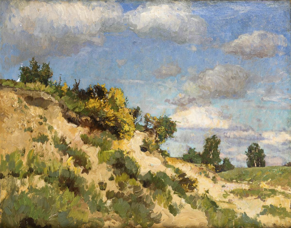 Heller Sonnenschein über der bewachsenen Düne nahe einem Birkenwäldchen. Löcher von Reißzwecken an den Rändern.