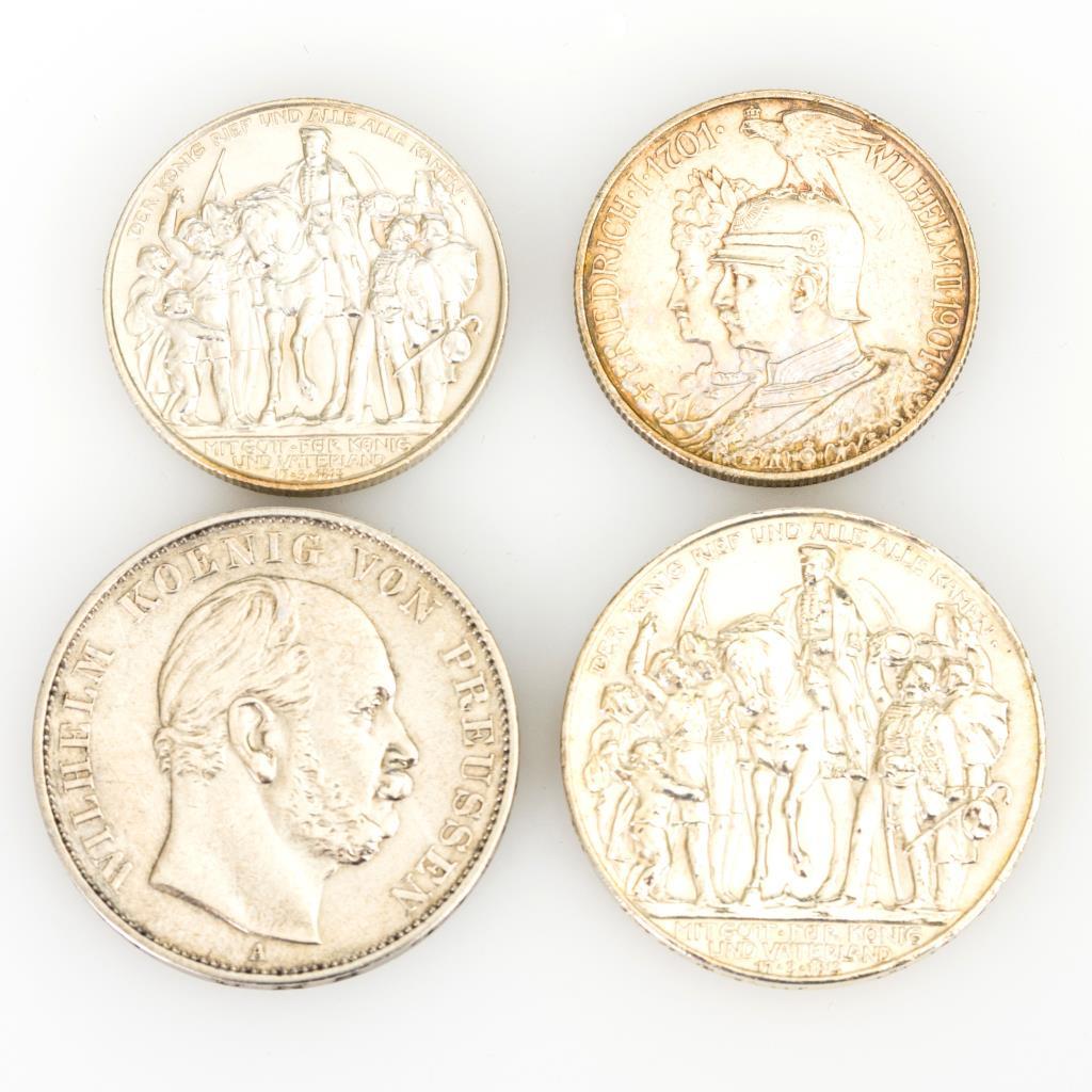 2 Mark, 1901, "Friedrich I. 1701 - Wilhelm II. 1901" / 2 Mark, 1913, "Der König rief und alle, alle kamen" / 3 Mark, 1913, "Der König rief und alle, alle kamen" / Sieges-Thaler 1871, "Wilhelm Koenig von Preussen" . Zustand: ss.