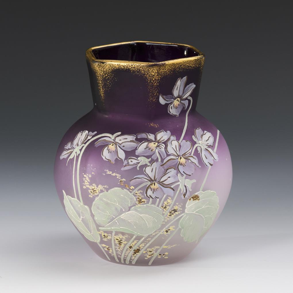 Farbloses, mattiertes Glas mit violettem Randverlauf, polychrome Emailmalerei, Goldstaffage. H 13,5 cm.