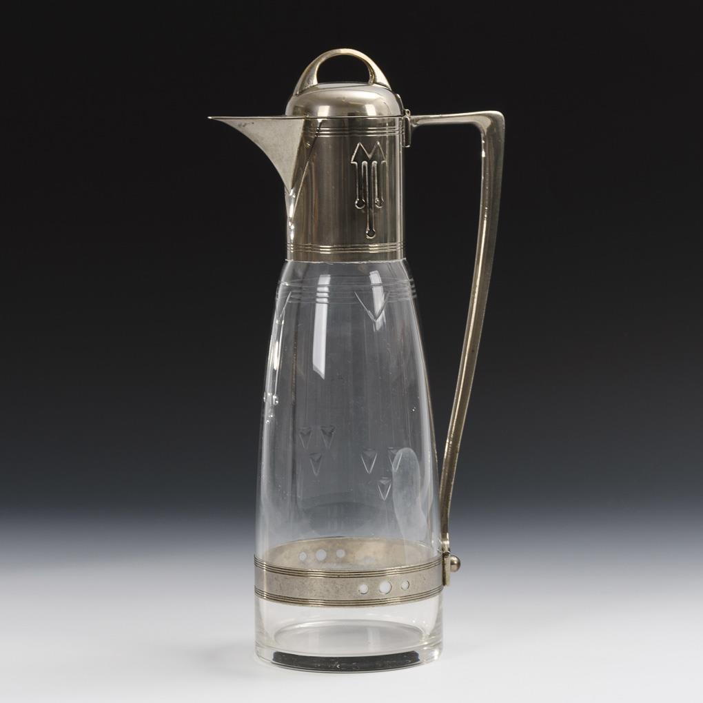 Leicht konischer Korpus mit linearem Schliffdekor im Stil der Wiener Secession, metallmontierter J-Henkel und Hals mit Scharnierdeckel.