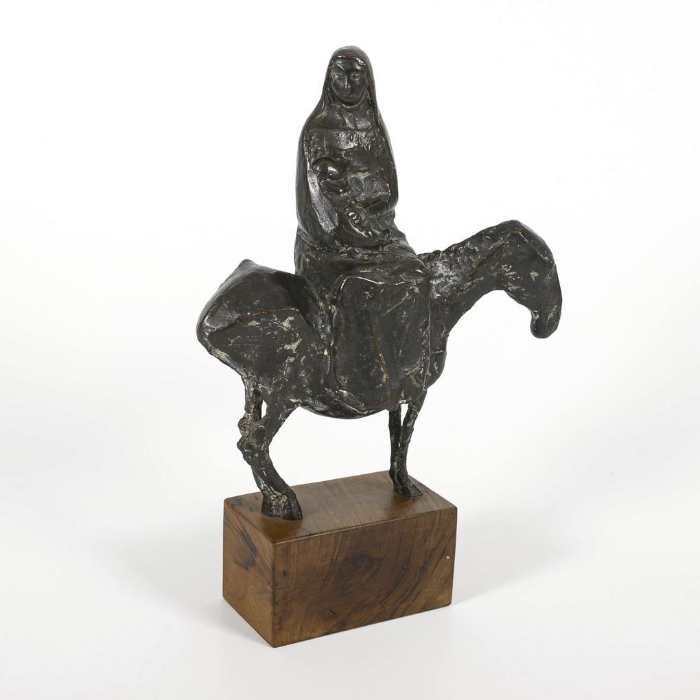 Maria mit dem Jesuskind im Arm, auf dem Esel reitend.