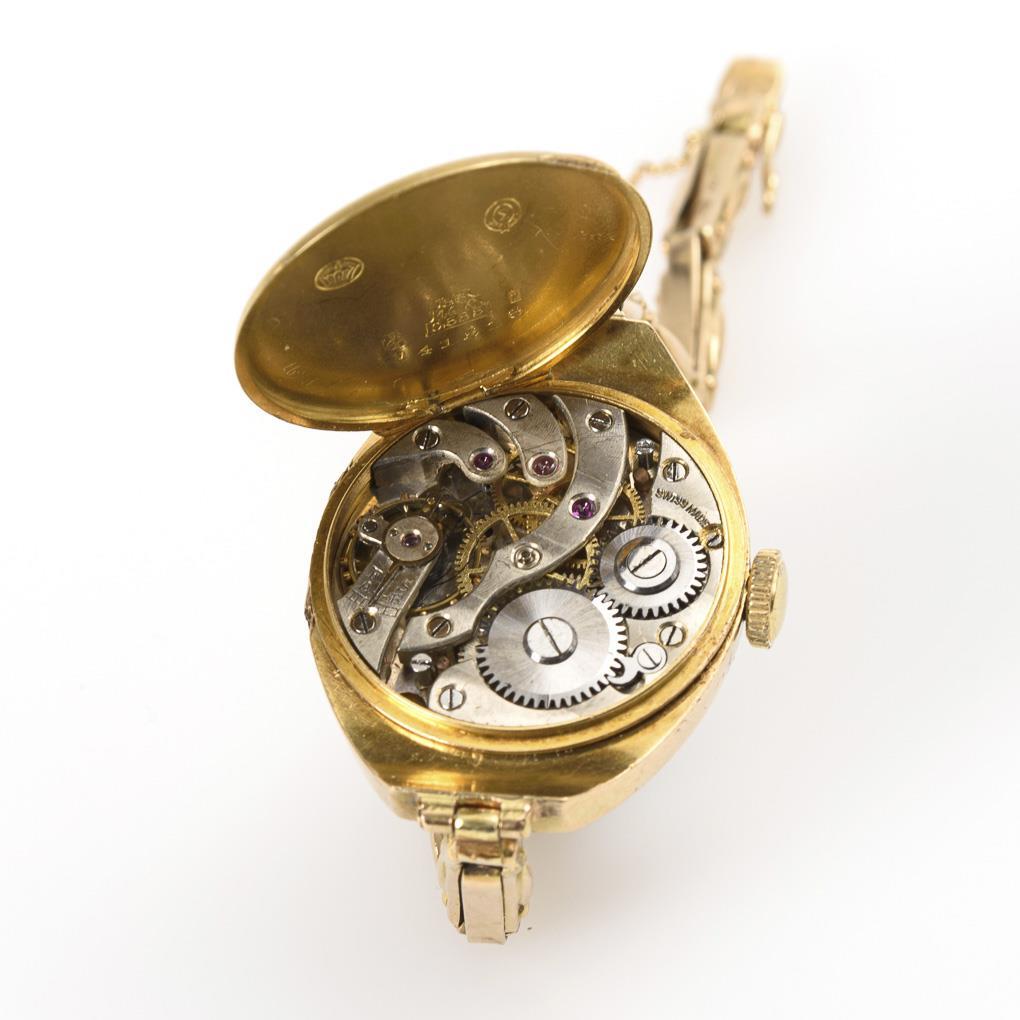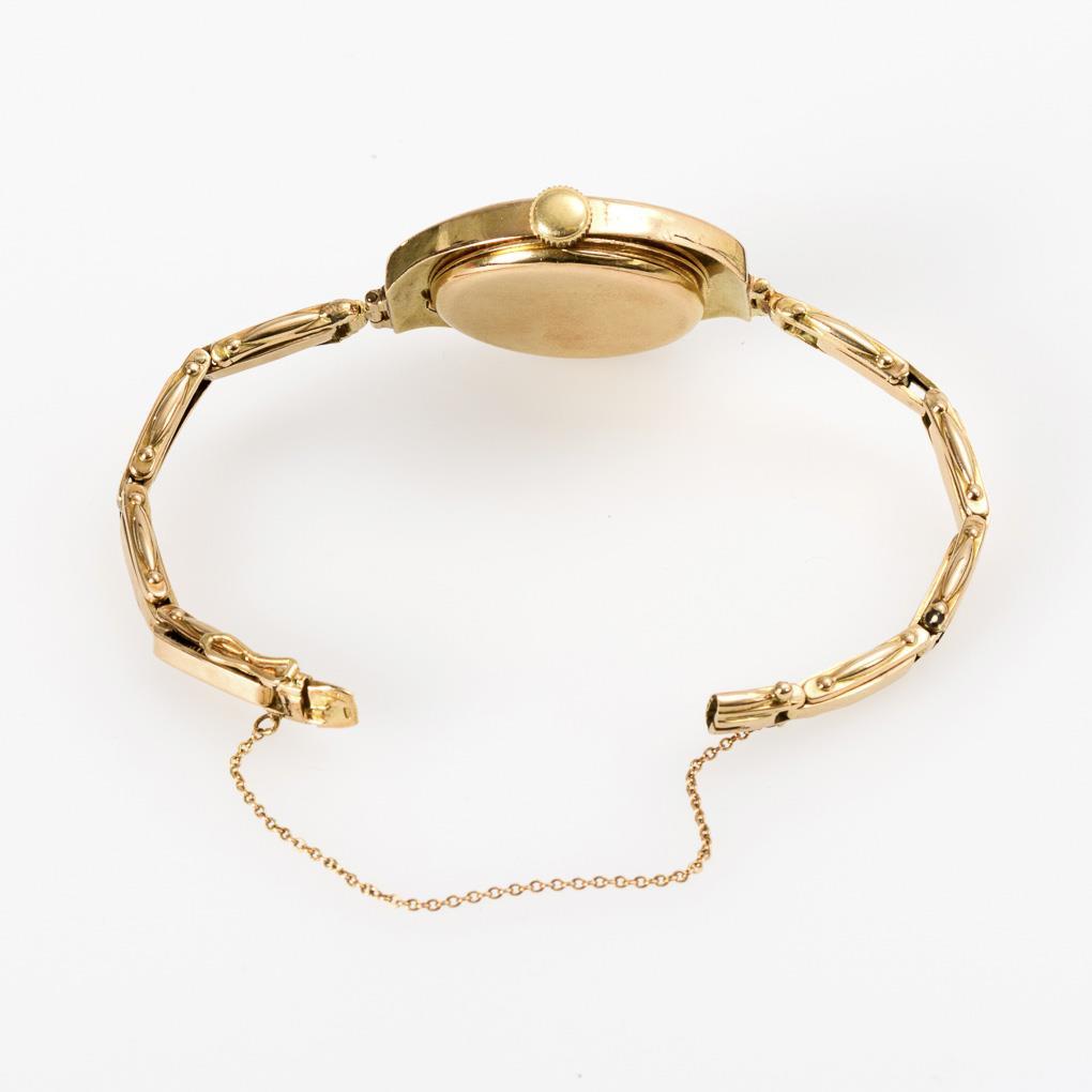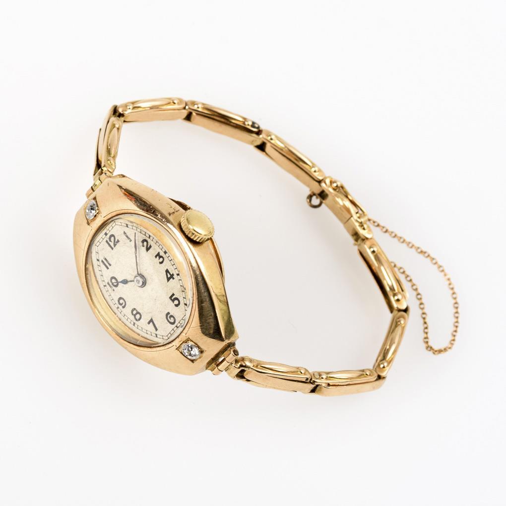 Ovalrechteckiges Gehäuse mit runder Vertiefung und Ziersteinbesatz (1x Diamant). Zifferblatt mit arabischen Zahlen, Minutenkranz und gebläuten Spade-Zeigern. An goldenem Zuggliederband mit Steckschließe und Sicherheitskette, L ca. 17,5 cm. Minimale Alters- und Gebrauchsspuren.