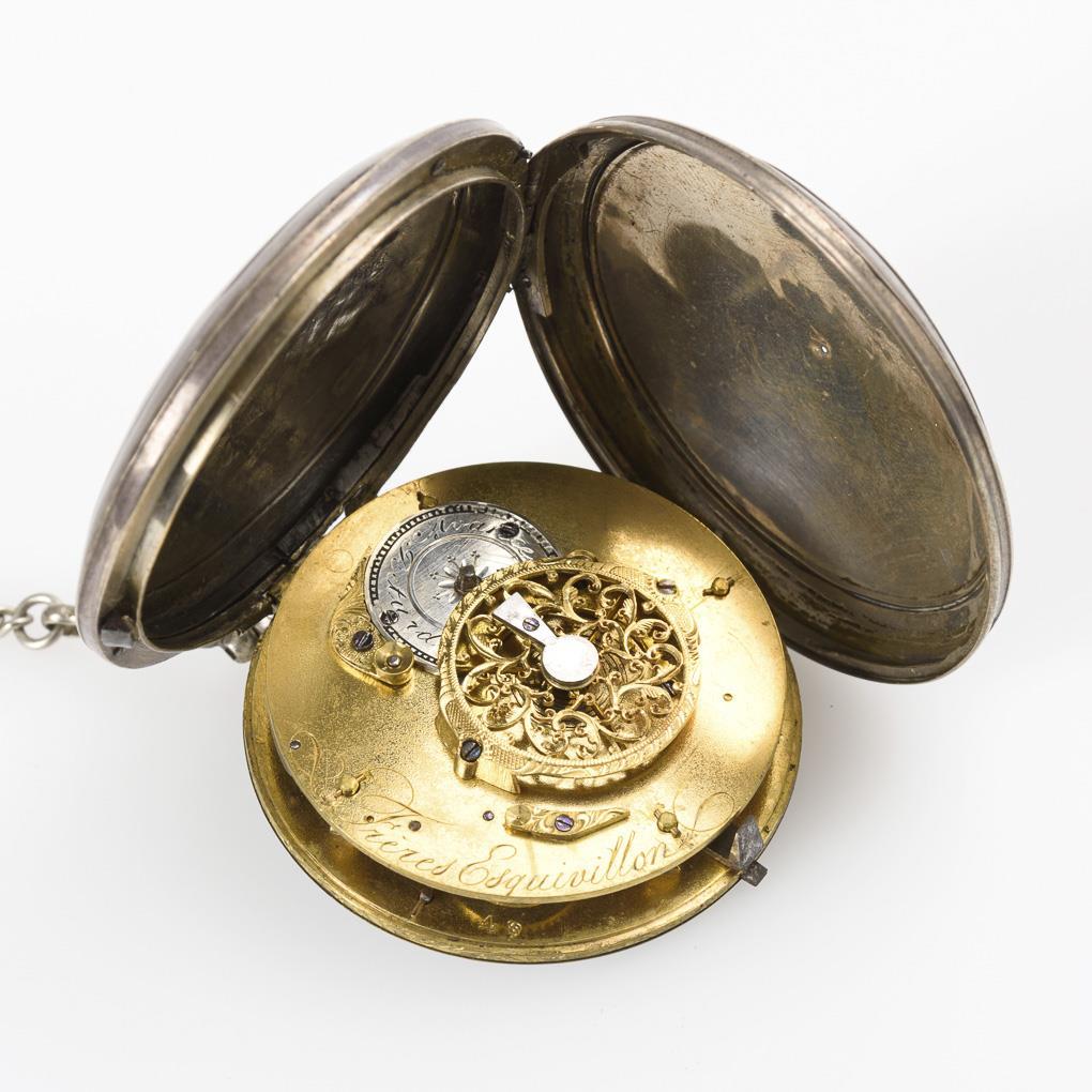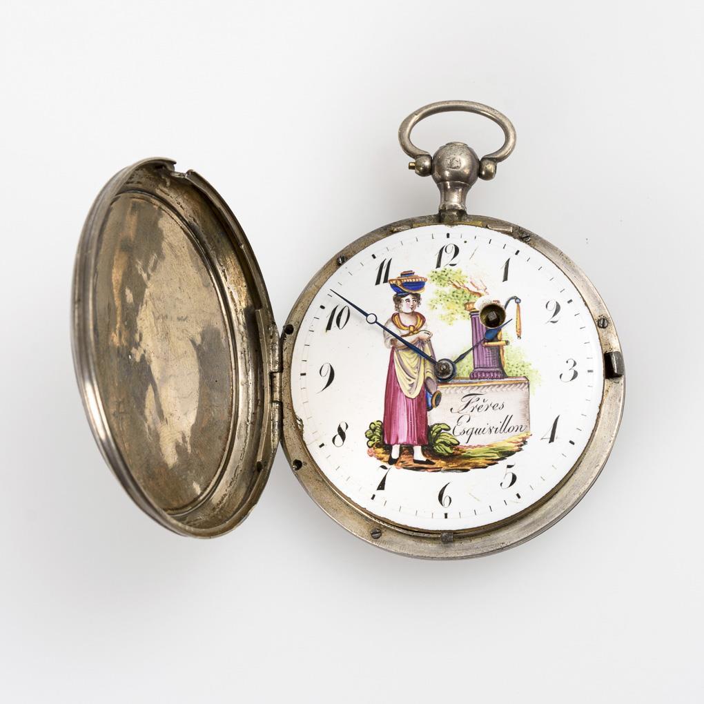 Silberne Spindeltaschenuhr mit farbig bemaltem Zifferblatt. LES FRÈRES ESQUIVILLON.