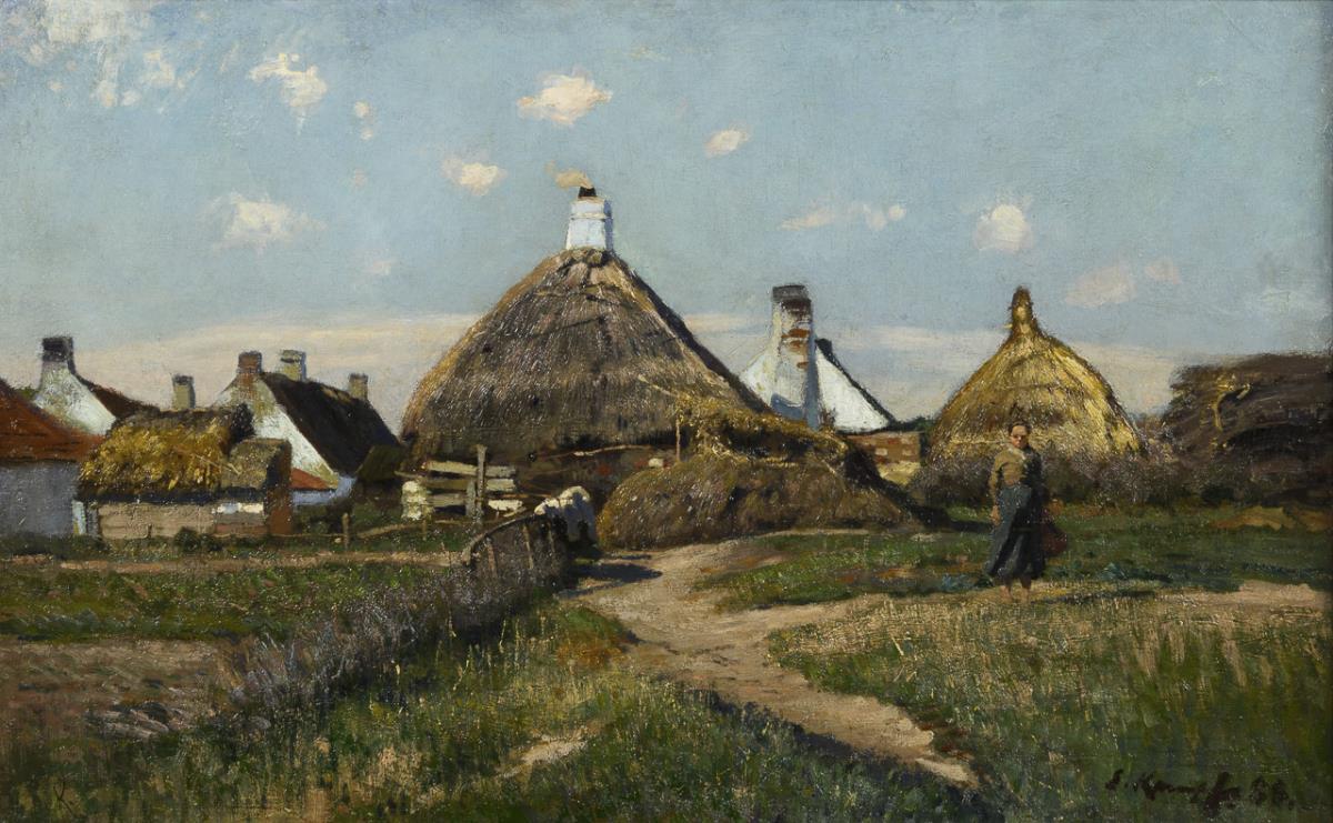 Reetgedeckte Häuser im hellen Morgenlicht mit Staffagefigur. Leichte Altersspuren.