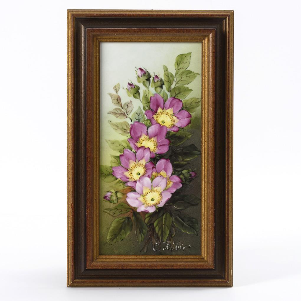Rechteckige Bildplatte mit der Darstellung eines Straußes Hundrosen.
