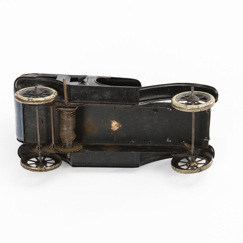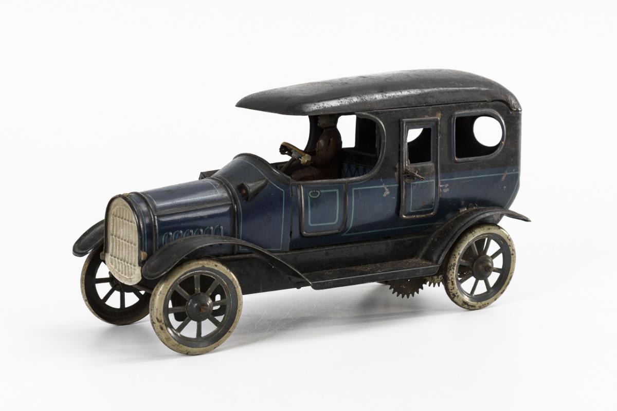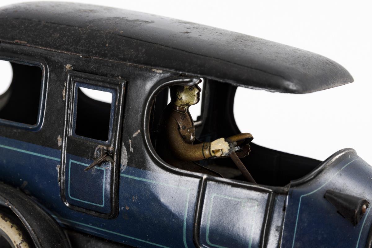 Dunkelblau lackiertes Rechtslenker-Auto mit schwarzem Dach und Chauffeur. Federwerk intakt, ohne Schlüssel. Kleine Lackdefekte.