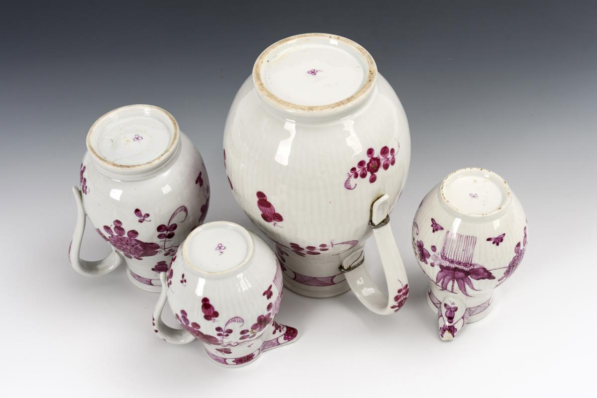 Gebrochen gerippte Porzellane mit purpurfarben gemaltem Garbenmuster. 4 verschiedene Kannen (H 15,5-26,5 cm), 2 Zuckerdosen (H 10,5 cm), 1 Teedose (ohne Deckel; H 10,5 cm), 3 Tassen (H 4 cm) mit 5 Untertassen (Ø 13,5 cm) und 1 Schale (L 17,5 cm). Henkel der Kaffeekanne alt repariert, Schneppe einer Kanne bestoßen, Haarriss in beiden Zuckerdosenwandungen und 1 Tassenhenkel, Standring der Schale bestoßen, Chip an 1 Untertassenrand.