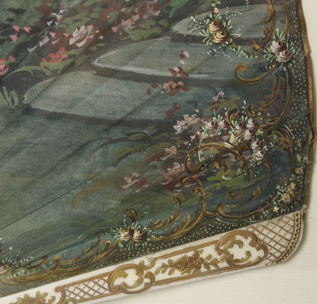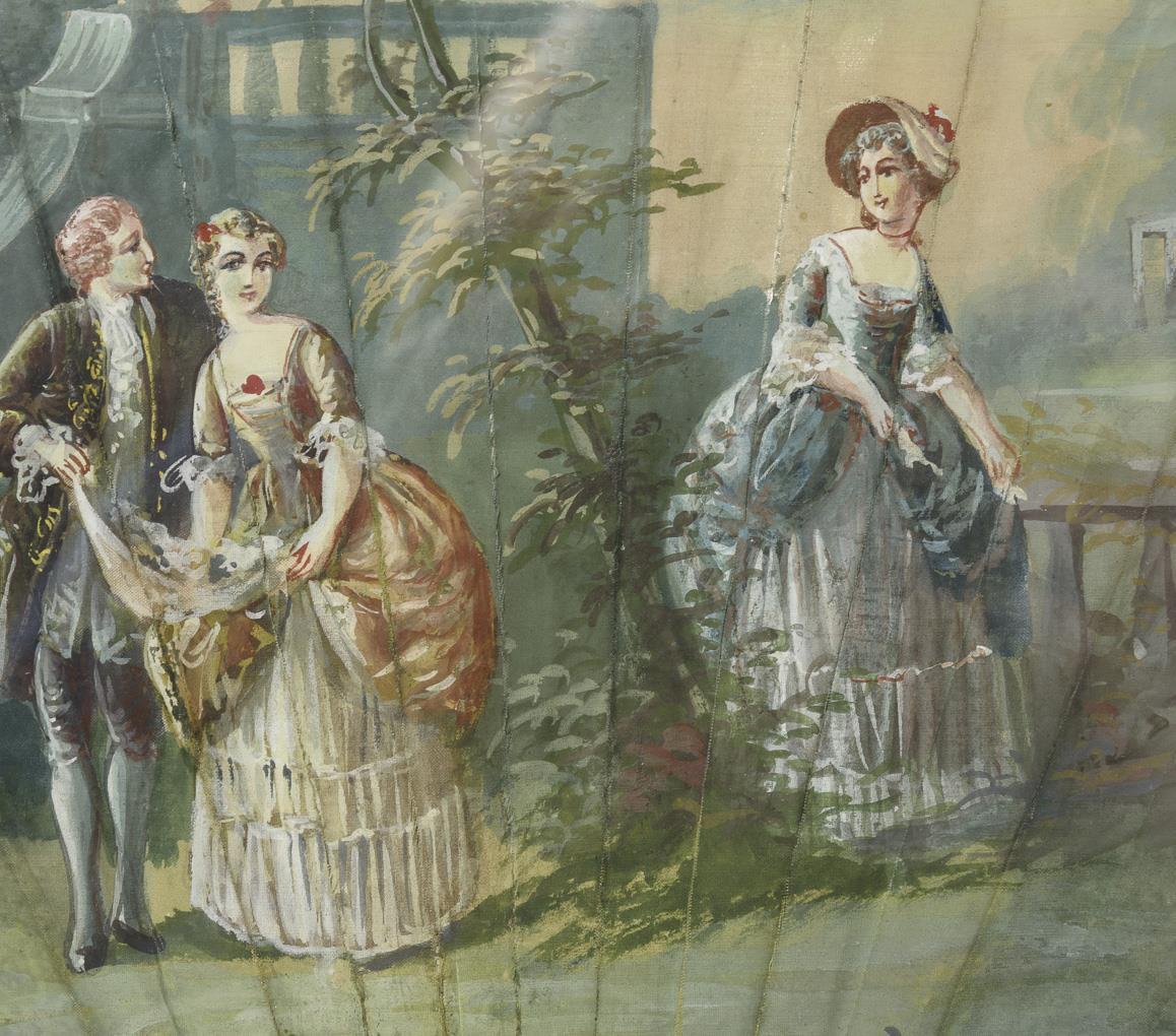 Vollständig bemaltes Blatt mit Rokoko-Liebespaar und Hofdame in der Parklandschaft. Am Rand gemaltes Ornament mit Blumen und Rocaillen. Knickspuren teils gerissen, 1 minimale Fehlstelle, unauffällige Klebespuren.