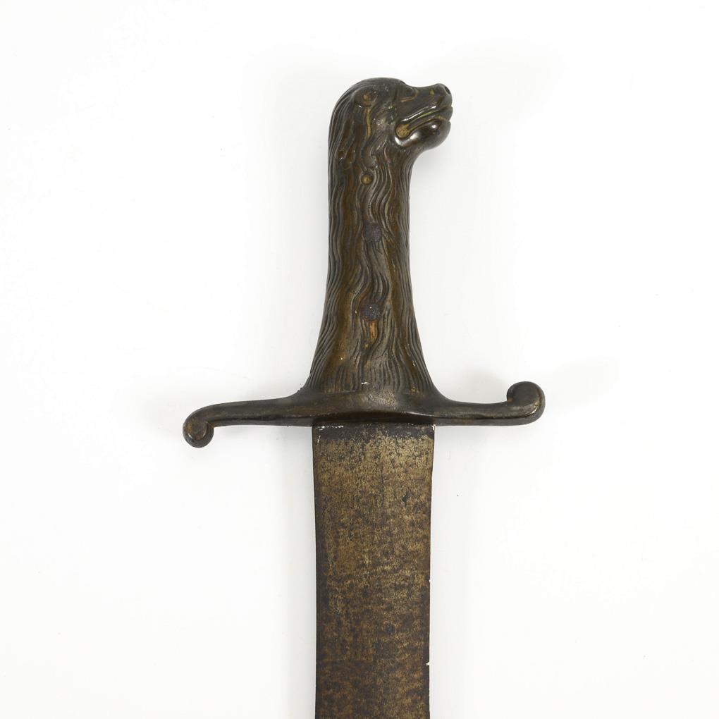 Zweischneidige, gerade Klinge mit Spitze in der Mittellinie. Klinge gestempelt "1034". Messinggriff aus einem Stück mit Löwenkopfknauf, dessen 'Fell' die Struktur des ganzen Griffes bildet. Gerade Parierstange mit s-förmigen Enden. Wohl Truppenstempel abgeschliffen (Artillerieseitengewehr oder Faschinenmesser). Alters- und Gebrauchsspuren.