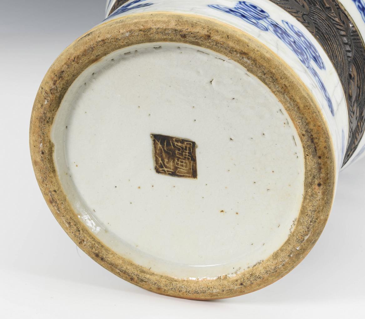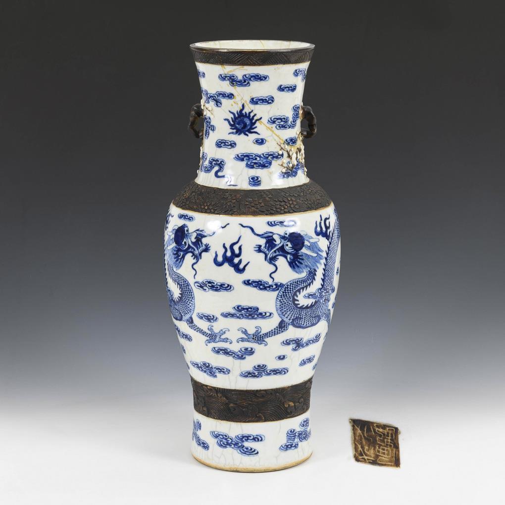 Qualitätvolle Malerei zweier Drachen zwischen Wolken. Braune, unglasierte, reliefierte Ornamentbänder, in dieser Art sind auch die Handhaben als Teil des reliefierten Astes mit Blüten und Knospen. Glasur mit Krakelee, Hals geklebt.