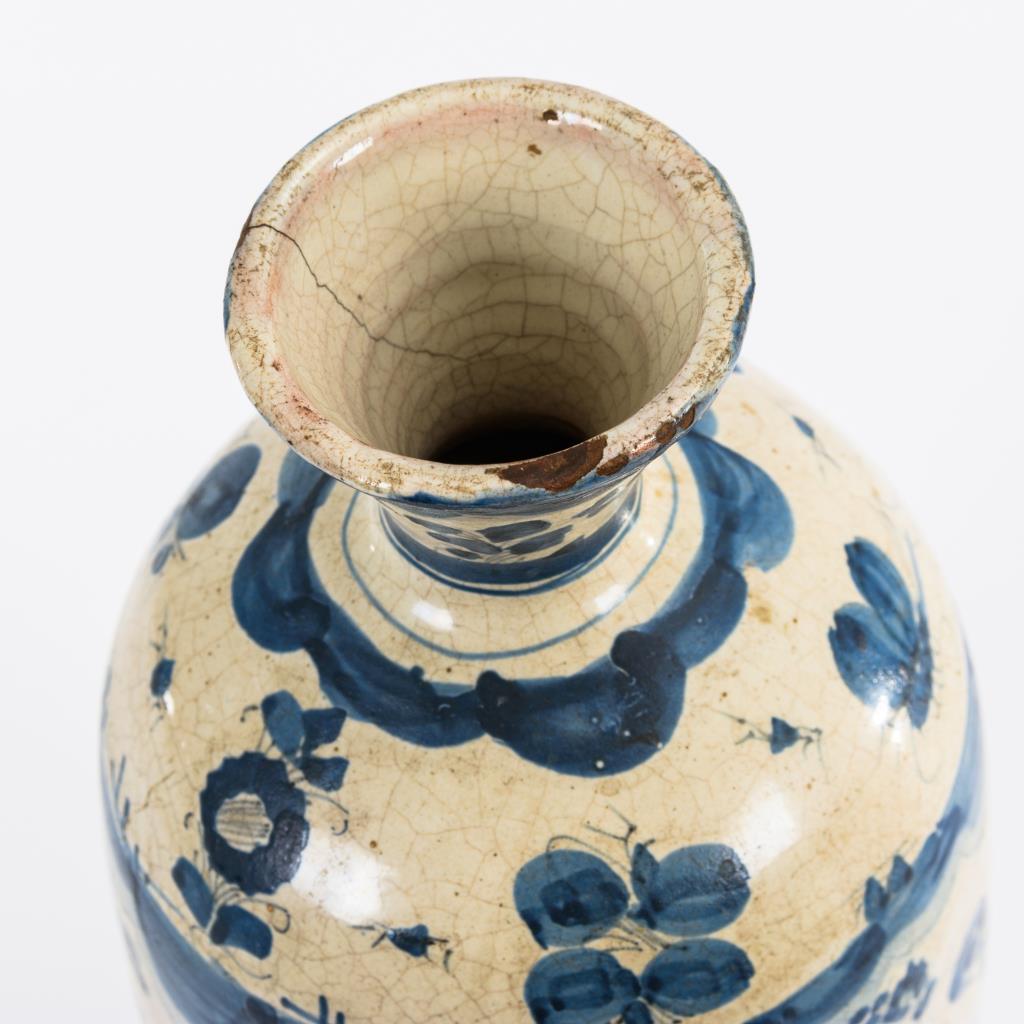 Roter Scherben, weiß glasiert, blau bemalt.H 30 cm.