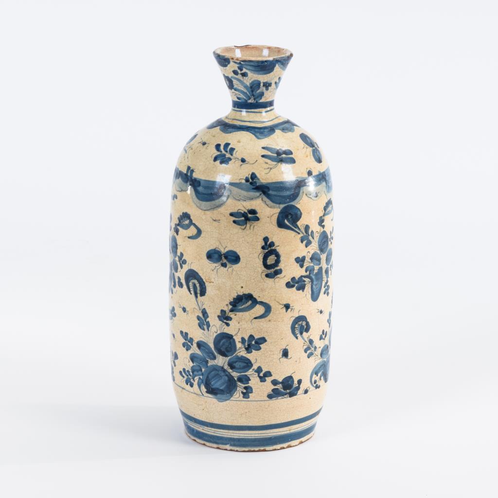 Enghalsgefäß mit zylindrischem Korpus, schauseitig eine Häusergruppe, umgeben von Blüten und Insekten. Mündungsriss, Wandungshaarriss, partiell bestoßen.