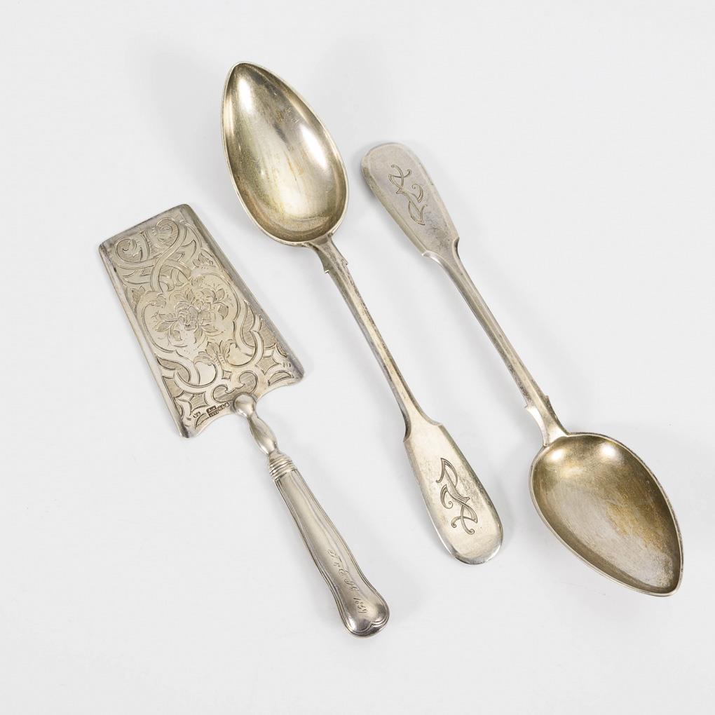 2 große Löffel mit verschlungener Monogrammgravur, L je 24,5 cm. Gravierter Heber, datiert 1859. L 21,5 cm.