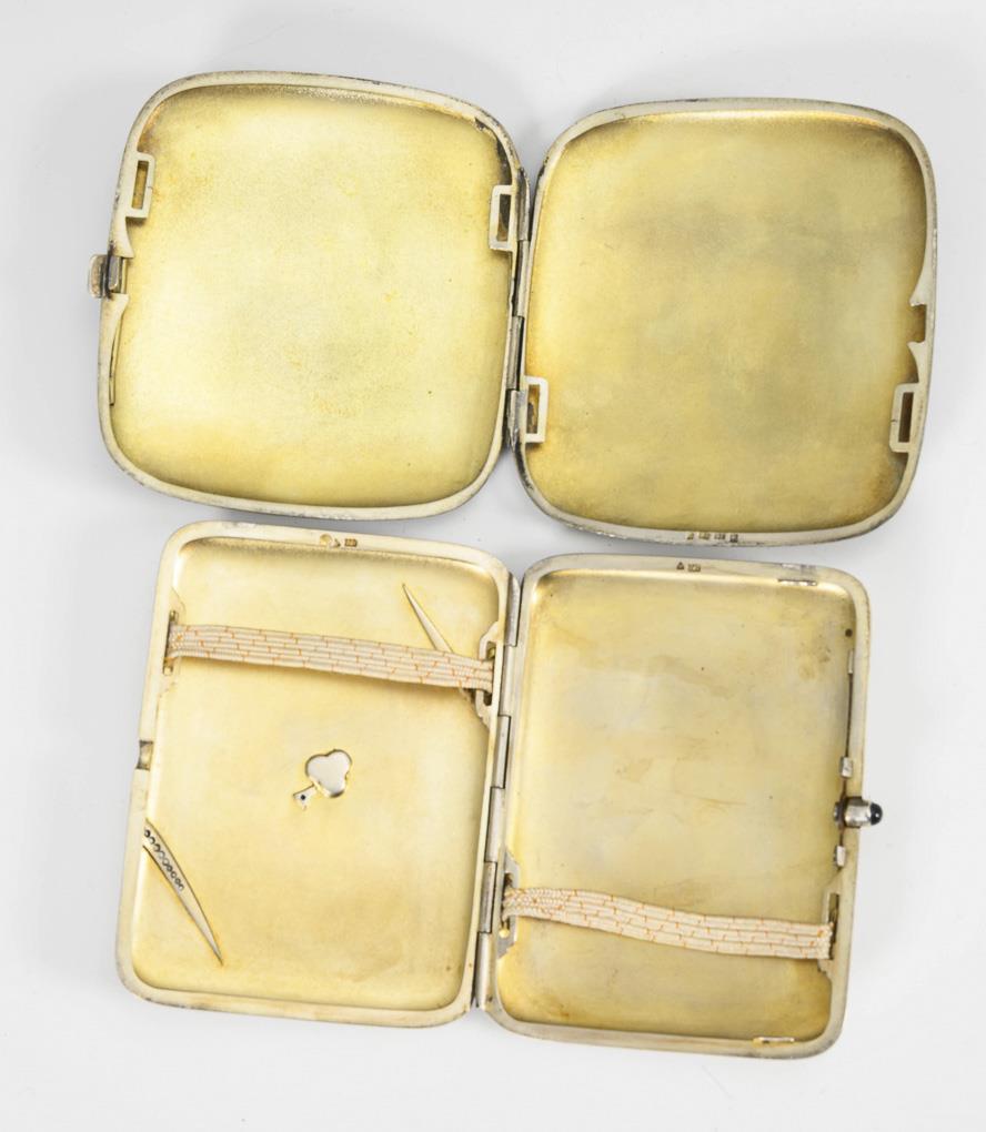 Elegante Etuis: 1x mit eingelegten blauen und farblosen Steinen (1 x 9 x 7 cm), 1x mit feinem Schachbrettmuster in Niello-Technik (1 x 9 x 8,5 cm). Gebrauchsspuren, minimal gedellt.