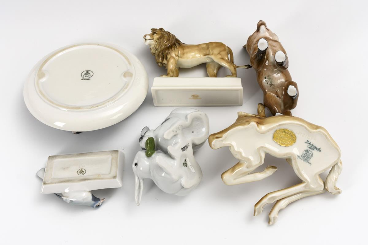Liegendes Fohlen (L 13,5 cm), Löwe (H 8 cm), Fuchswelpe (H 9 cm), Hasenpärchen (H 6 cm), Taube an kleiner Schale (L 8,5 cm) und Schale mit schwarzem Schwan (Ø 12,5 cm).