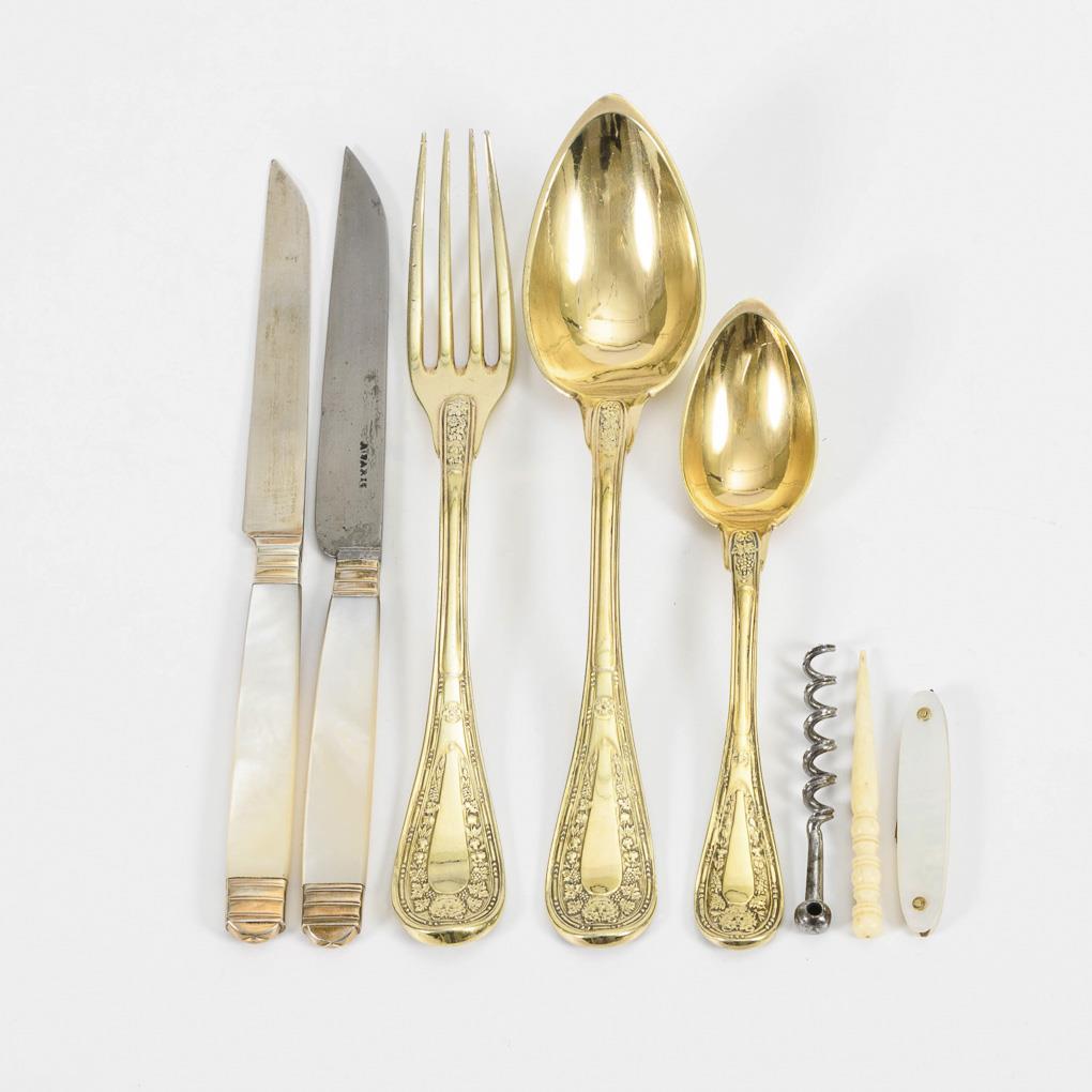 3 Teile vergoldetes Besteck (Gabel und 2 Löffel), 2 Messer mit Perlmuttgriff und 3 Teile Zubehör. 1 Messergriff minimal rissig.