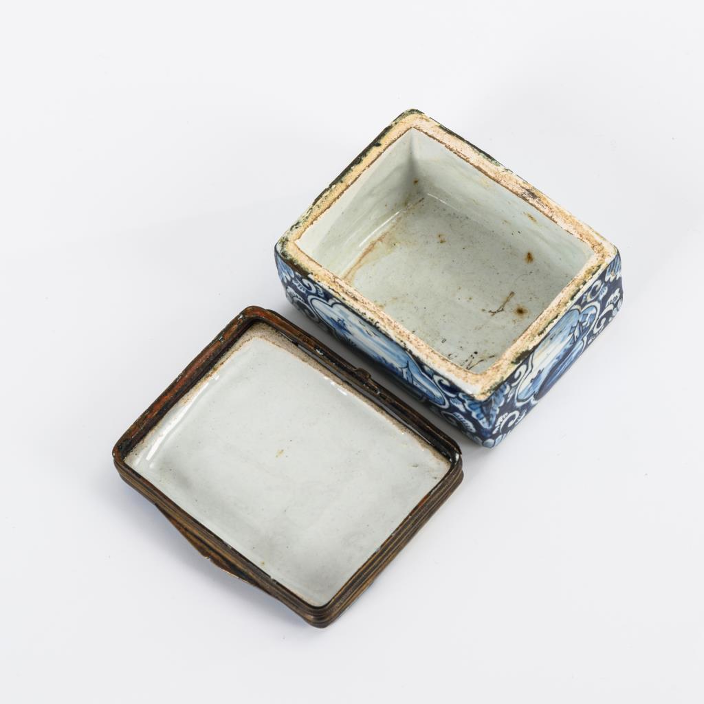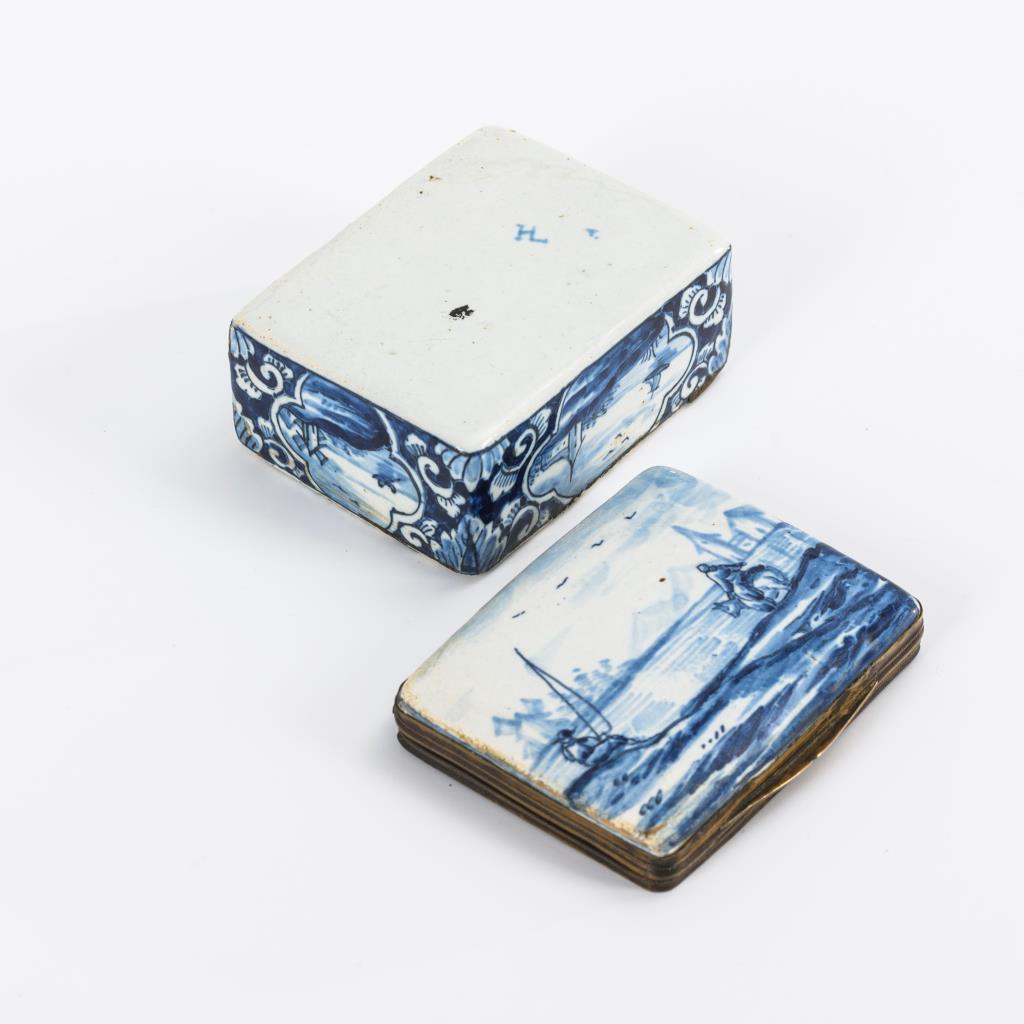 Kleine Rechteckdose mit Schiff- und Windmühlenmotiven in Vierpasskartuschen. Metallscharnier lose.