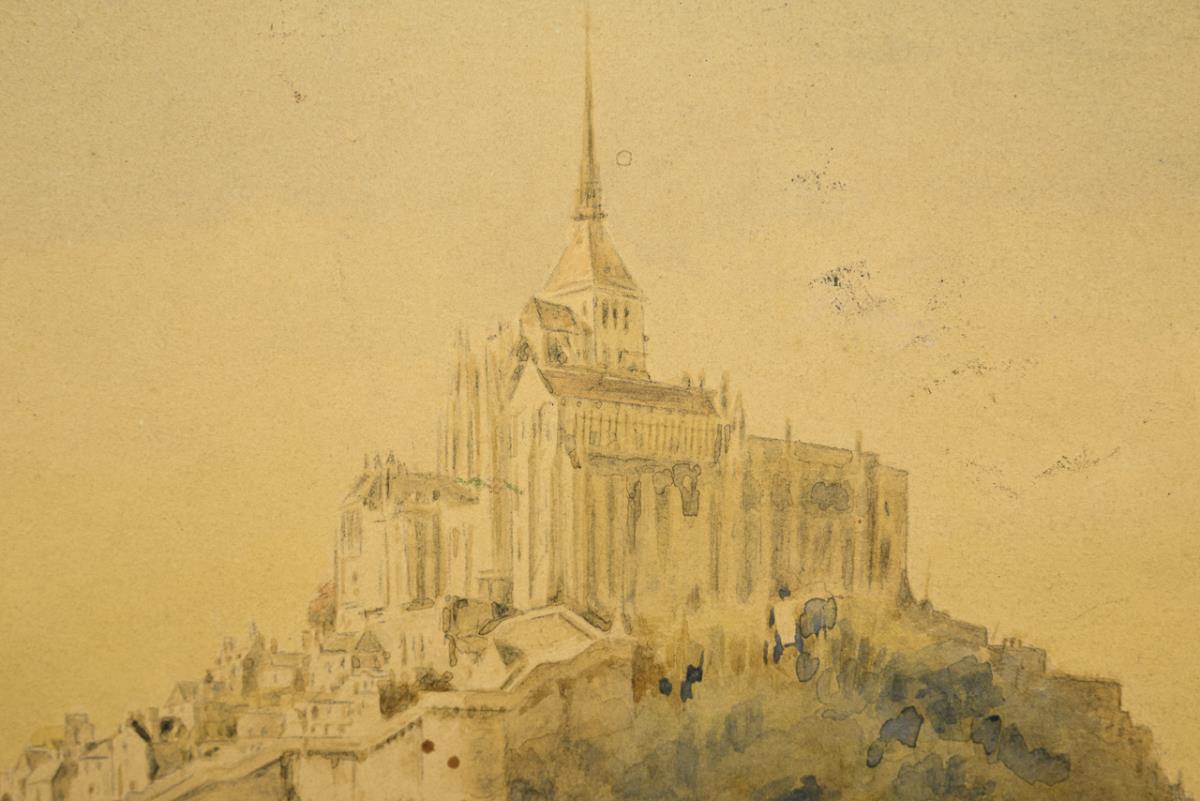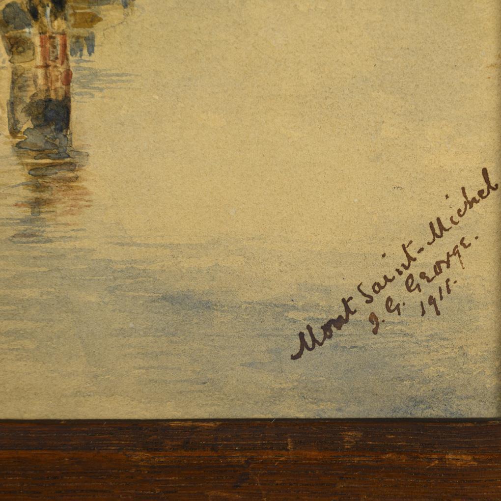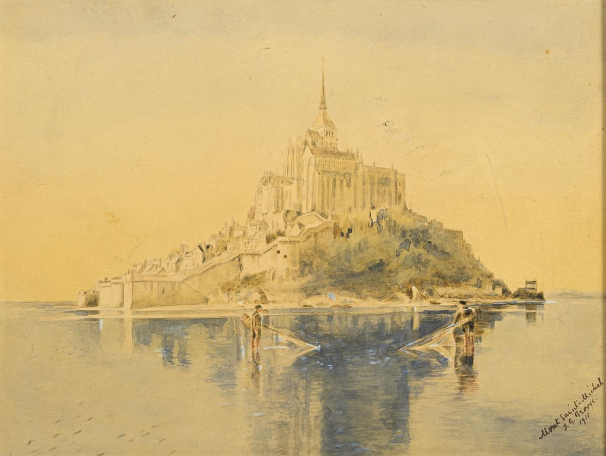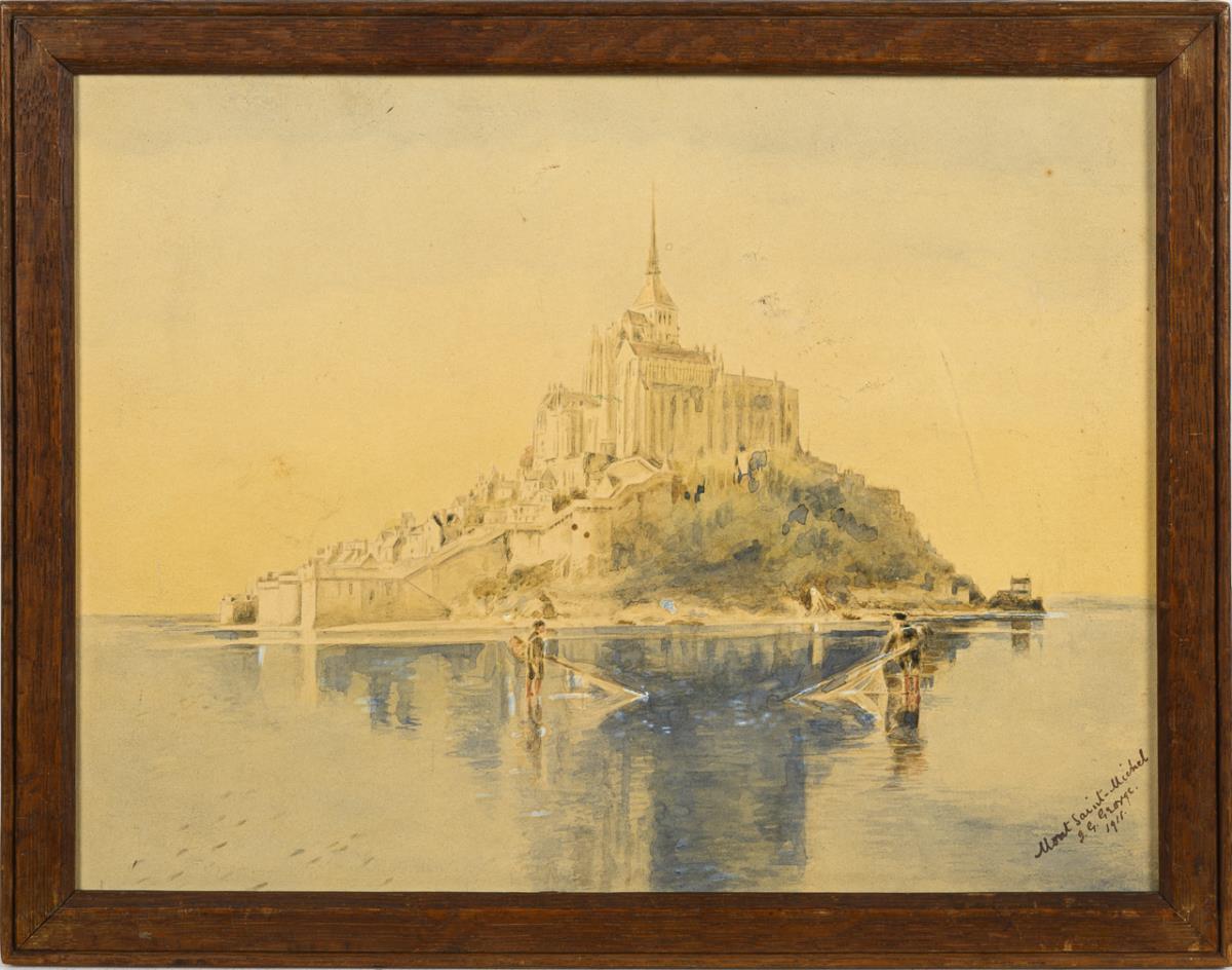 Fischer vor der Insel mit der Abtei und der kleinen Gemeinde an der französischen Küste. Leicht vergilbt.