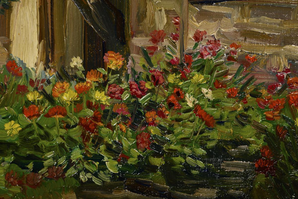Viele Blumenbeete im Sonnenschein auf dem Hof vor dem Haus.