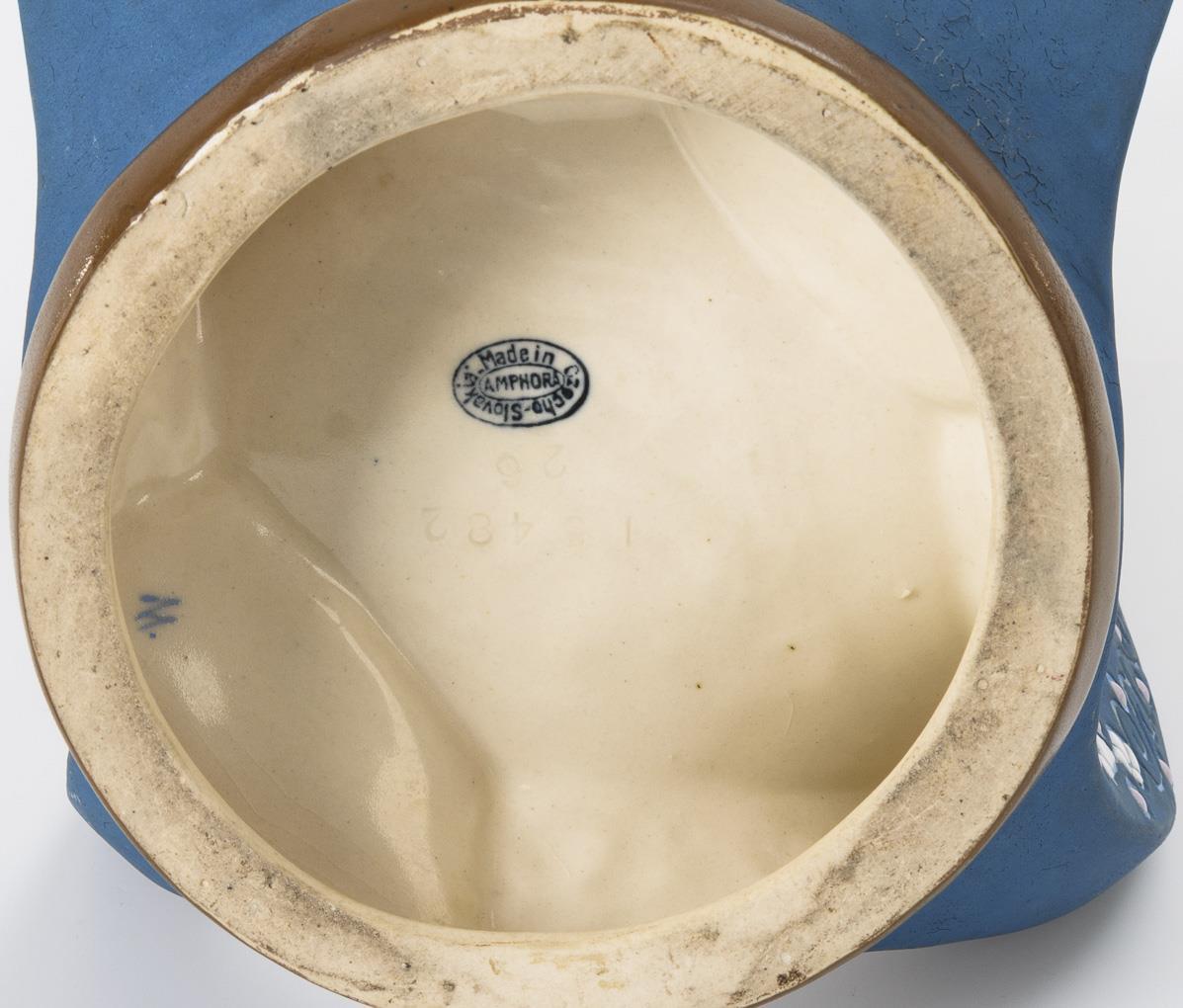 Brauner Eierschalenfond und azurblaue Mattglasur, farbig glasiert. H 30,5 cm.