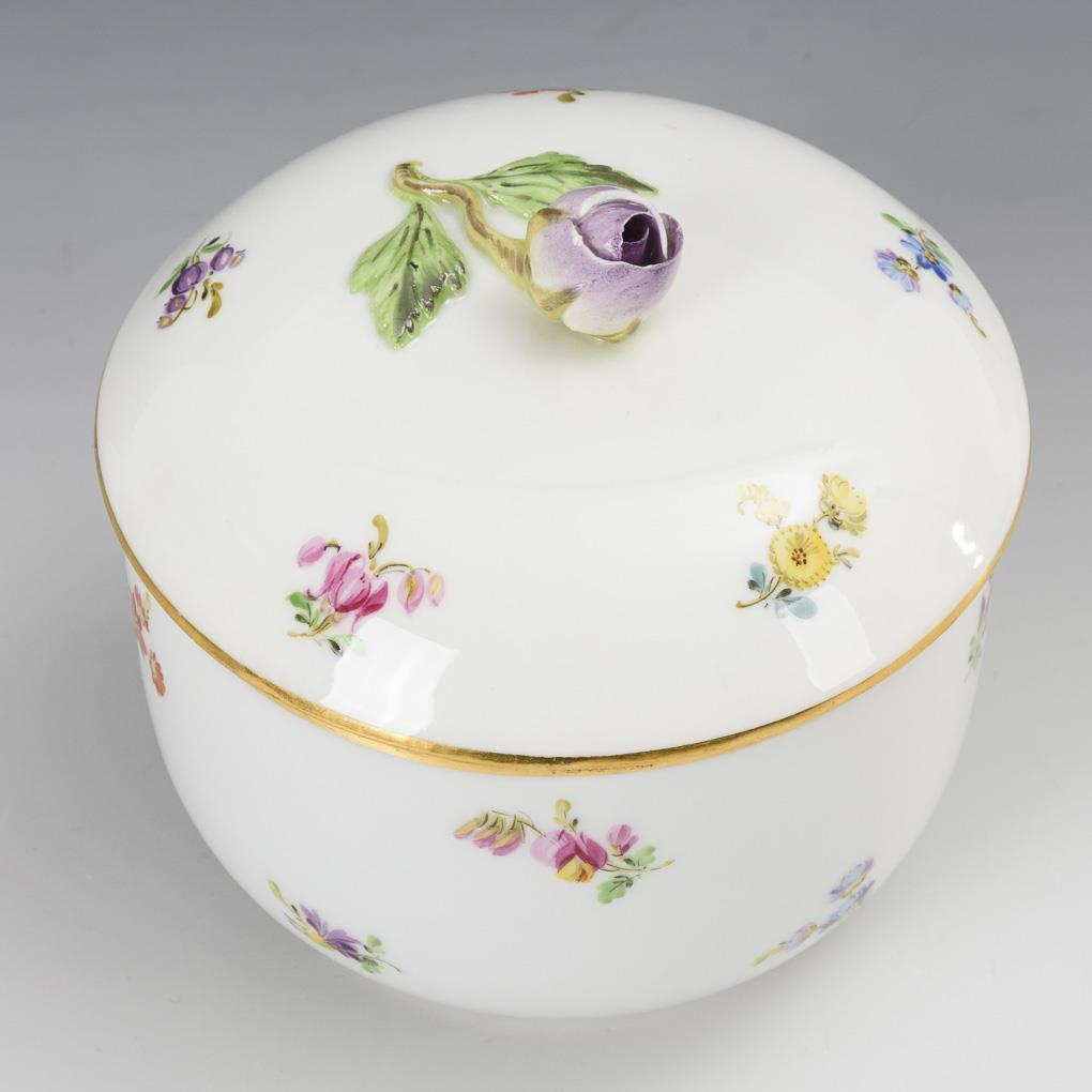 Milchkännchen (H 13,5 cm), Zuckerdose (H 11 cm), Mokkatasse (H 5 cm) und Untertasse (Ø 10,5 cm) mit Streublümchenmalerei. / Mokkatasse und Untertasse "Rote Rose". / 2 Kuchenteller mit Blumenmalerei (Ø 17,5 cm) und 1 Durchbruchteller mit gründer Streublümchenmalerei (Ø 20,5 cm). Durchbruchteller mit Farbabplatzern, Rosenknauf bestoßen.