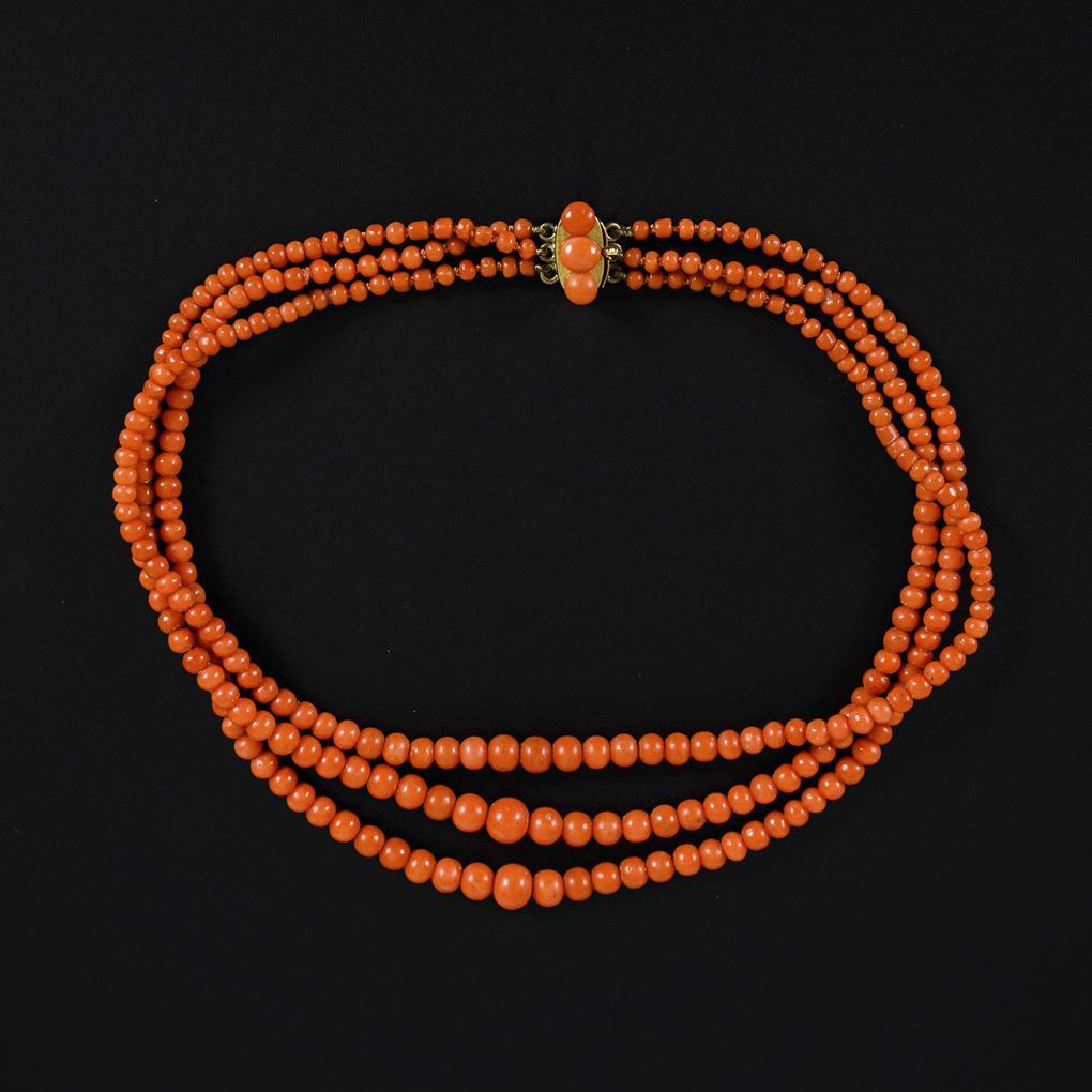 Kurze Schnürketten mit Korallen im Verlauf, an Kastenschloss.