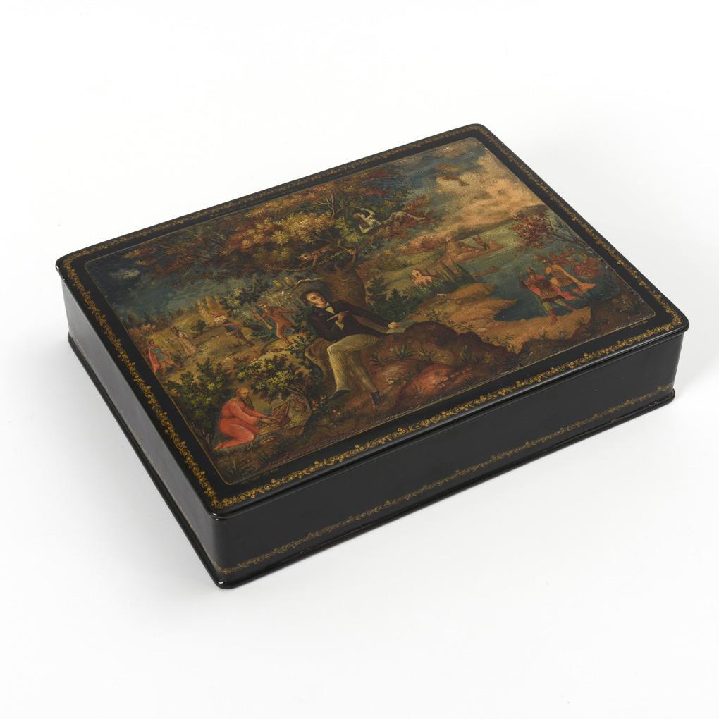 Handbemalte russische Lackdose mit Puschkin-Motiven.