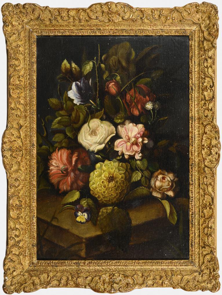 Üppiger Blumenstrauß mit verschiedenen Blumen auf einem Sims vor dunklem Hintergrund. Leinwand altdoubliert.