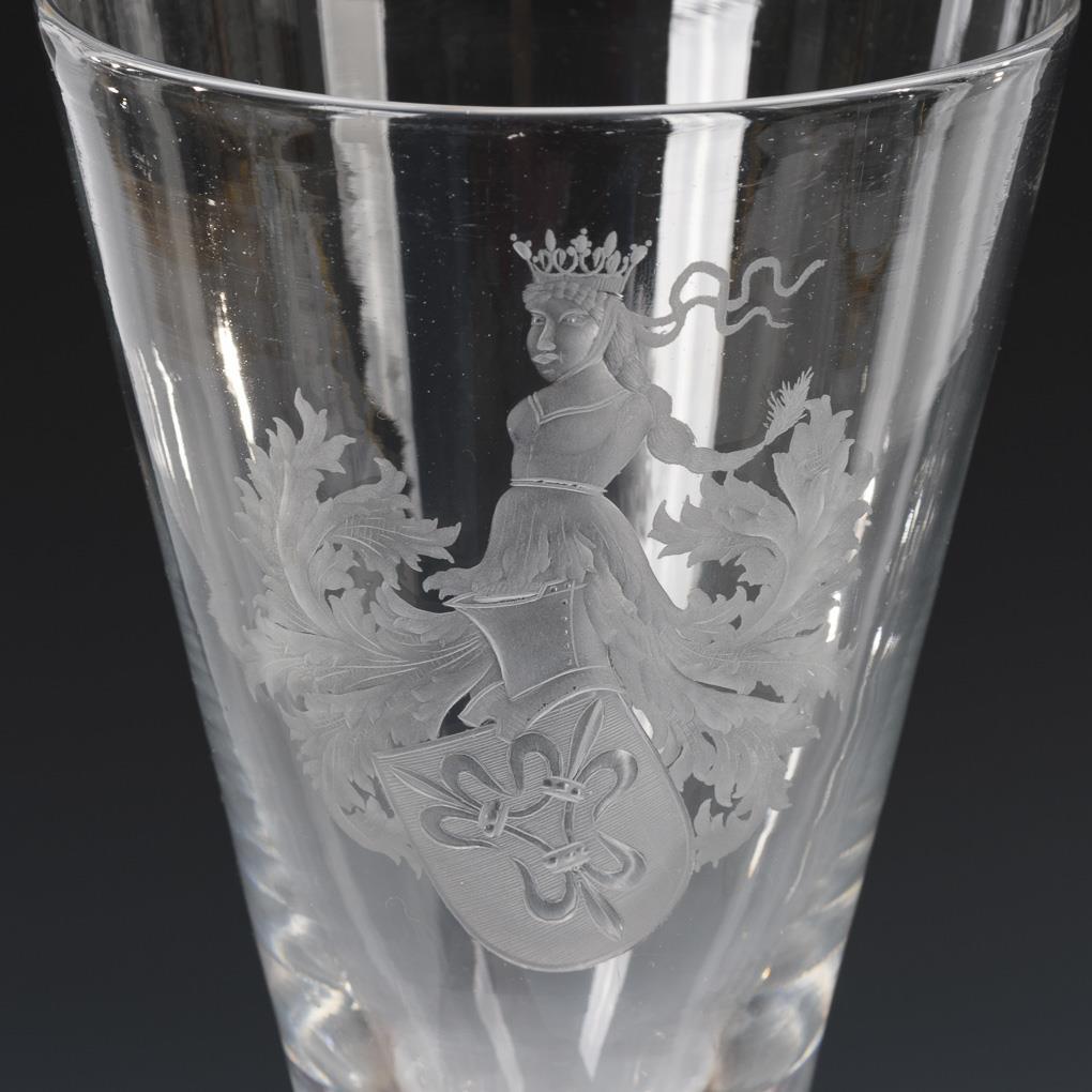 Konische, in den massivem Schaft mit eingestochenem Luftblasenkranz übergehende Kuppa, Rundfuß, ausgekugelter Abriss. 1x mit wabenfacettiertem Schaft und Goldrand. / 1x mit der schauseitigen Darstellung eines Wappenschildes mit drei Lilien (= Familie Nützel) und Helmzier mit der Halbfigur einer bekrönten Dame.