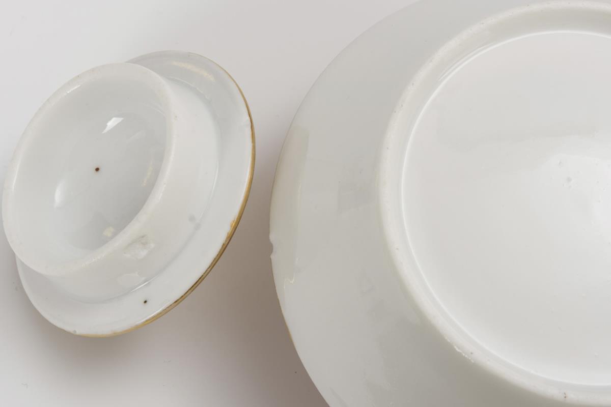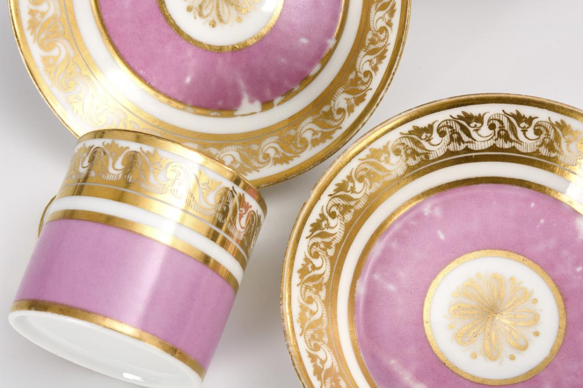 Rosafarbener Teilfond und reiche florale und ornamentale Goldmalerei. Zylinderkanne (H 16 cm), 2 Zylindertassen (H 6 cm) und 2 Untertassen (Ø 12,5 cm). Partieller Goldabrieb, 1 Deckelnase fehlt, 1 Tassenstand minimal bestoßen, beide Untertassenspiegel etwas berieben, 1 Untertasse mit Randchip, 1 Untertasse mit Randhaarriss.