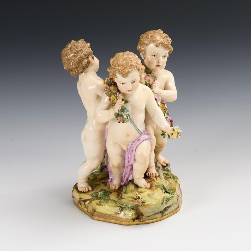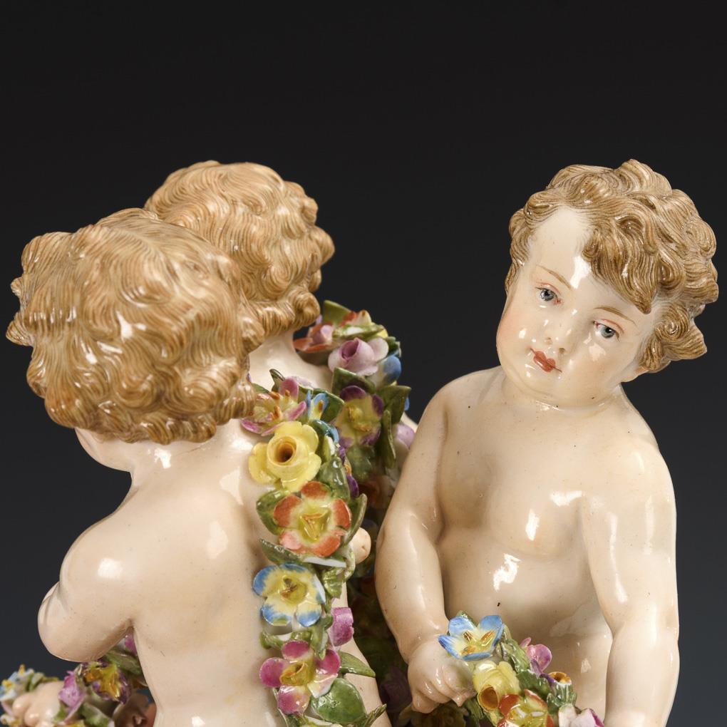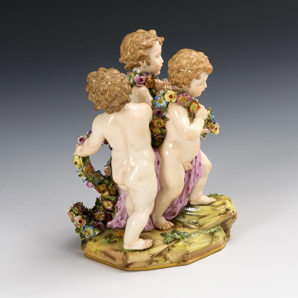 Drei, auf einem Felssockel stehende, eine große Blumengirlande tragende Putten. Bestoßungen an der Girlande, 1 Puttenarm restauriert.