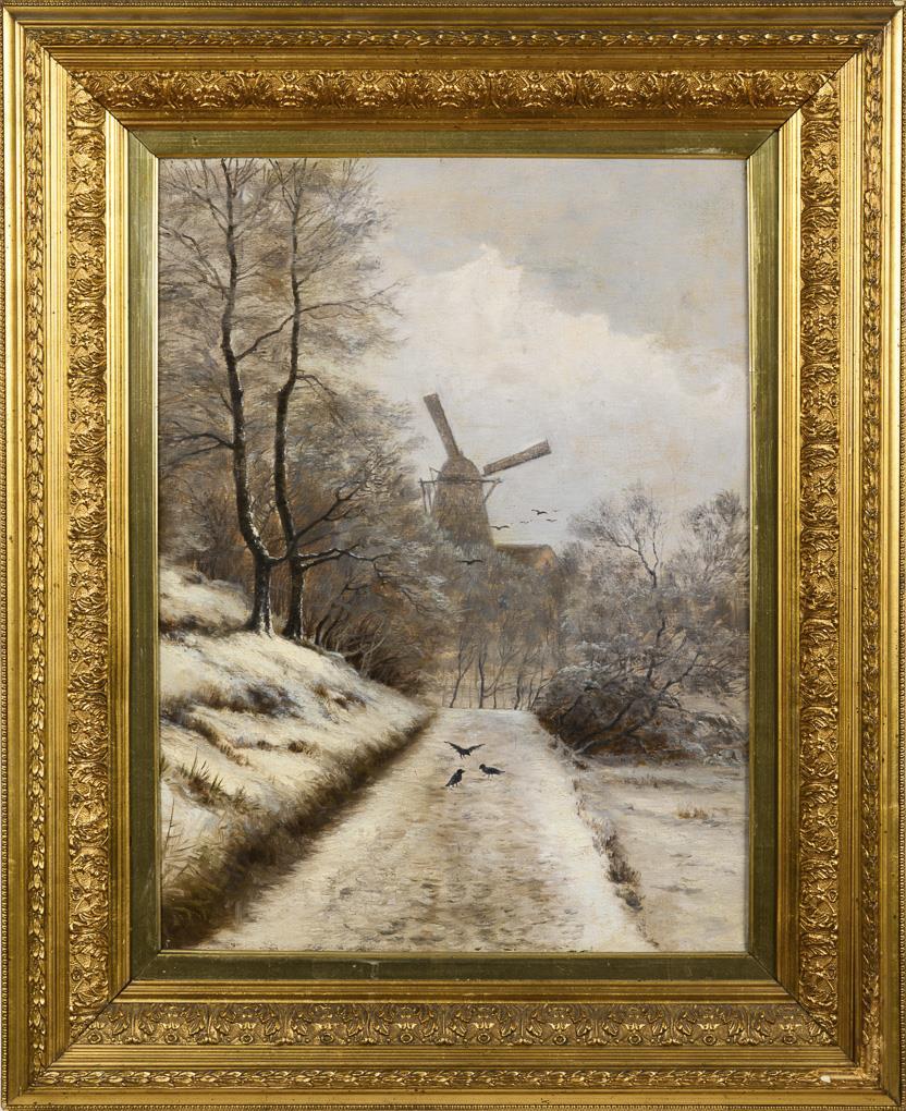 Vögel auf verschneiter Straße nahe einer Windmühle unter grauem Himmel. Altersspuren.