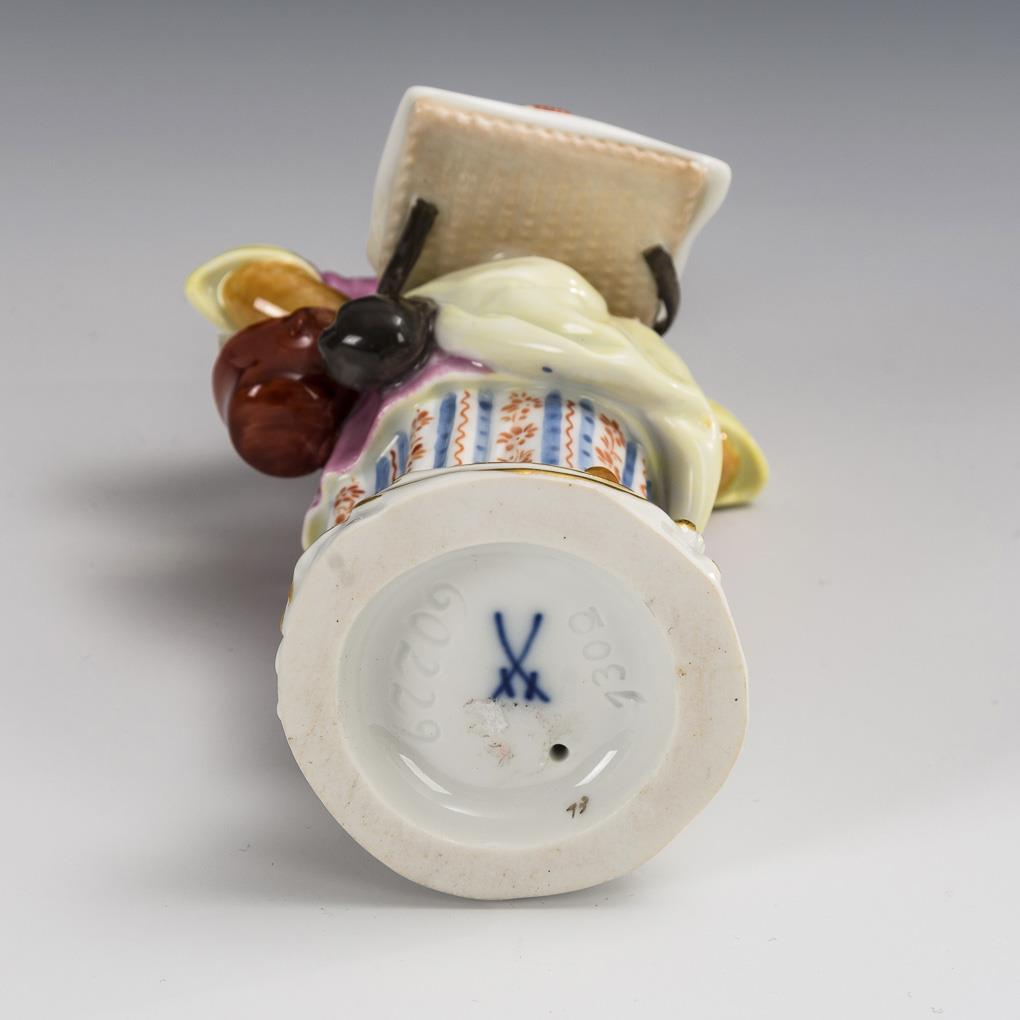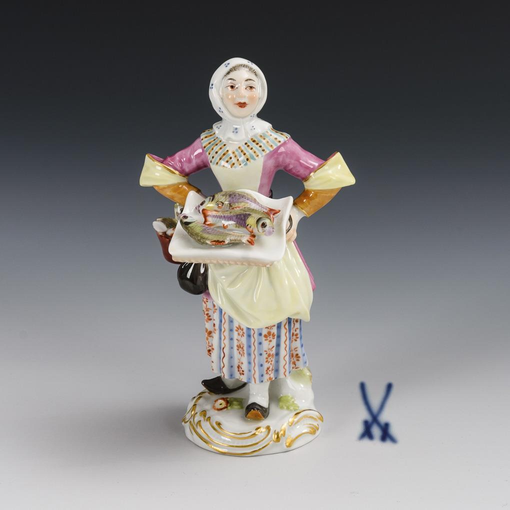 Auf einem Rocaillesockel stehende Händlerin, auf einem Tablett Fische feilbietend sowie ein Körbchen mit Fischen tragend. 1 Fisch bestoßen.