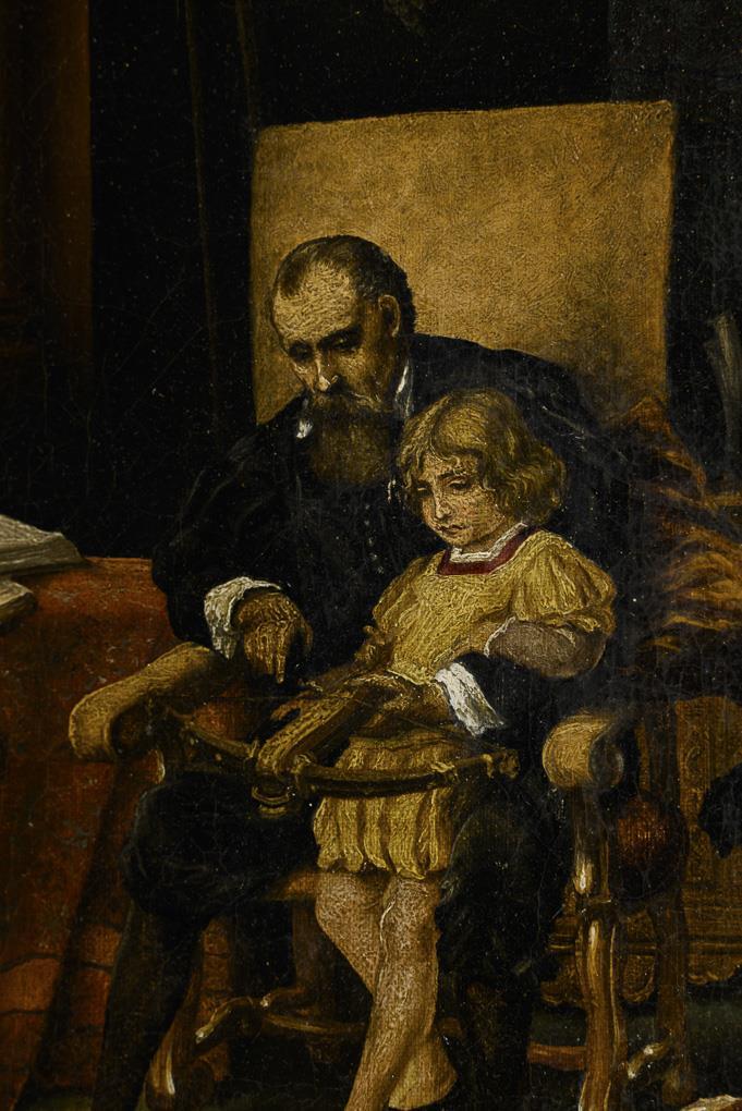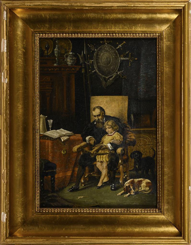 Der Großvater mit dem Enkel beim Erklären der Funktionsweise einer Armbrust in herrschaftlichem Zimmer mit den Hunden. Altersspuren.