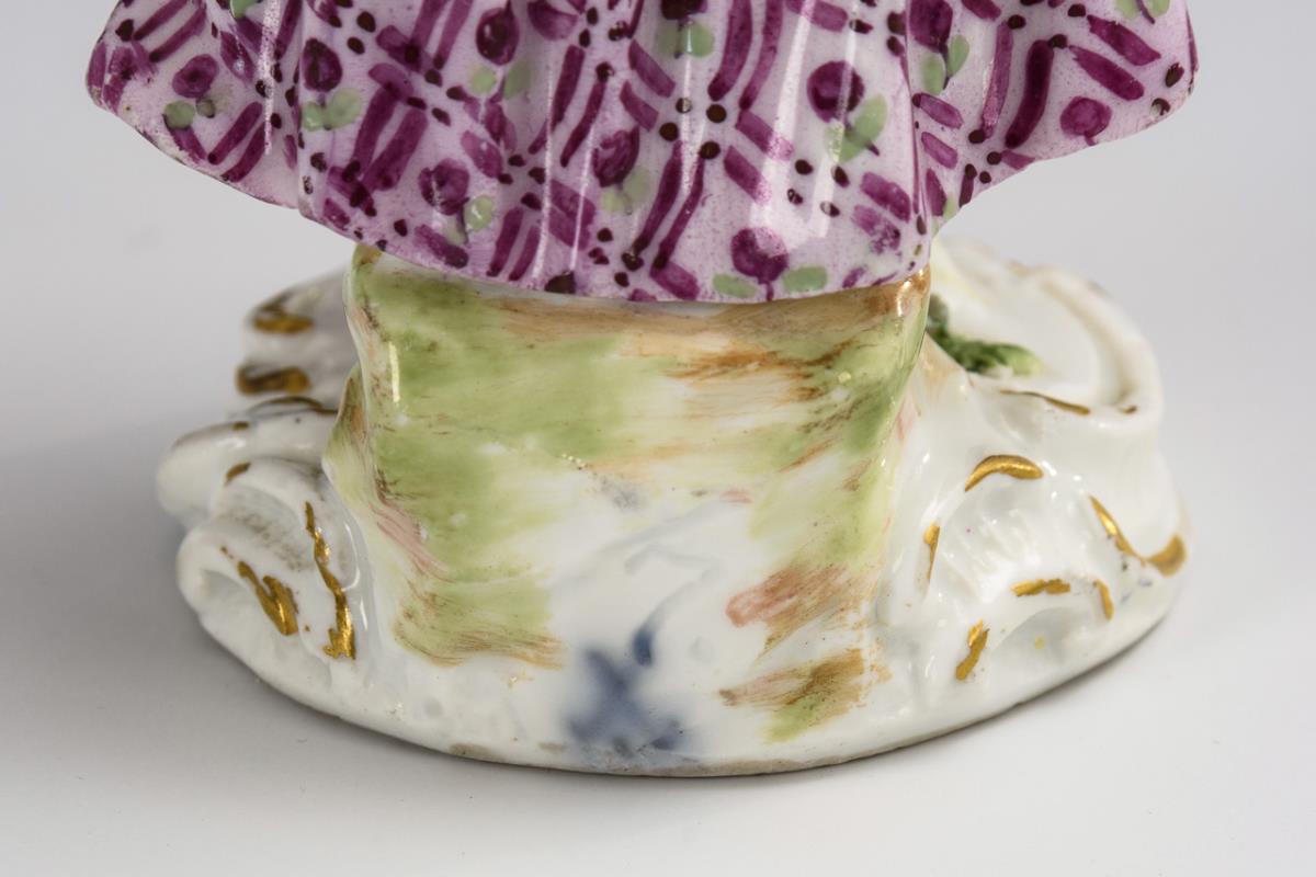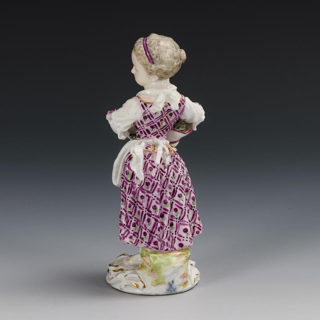 Auf einem Rocaillesockel stehendes Mädchen mit blütengefülltem Hut. Partieller Goldabrieb, Bestoßungen an den Blüten, Schleifen und Ärmelrüschen, Hals restauriert.