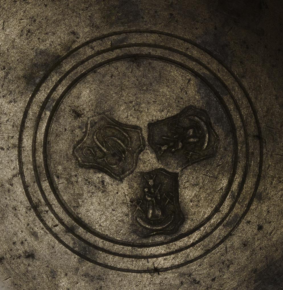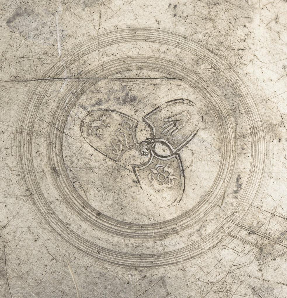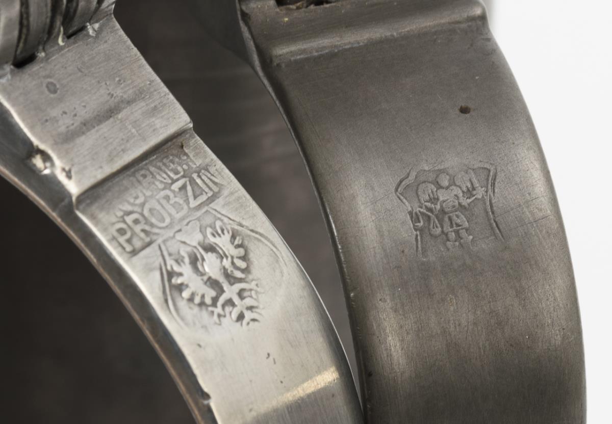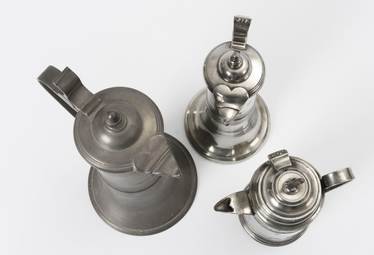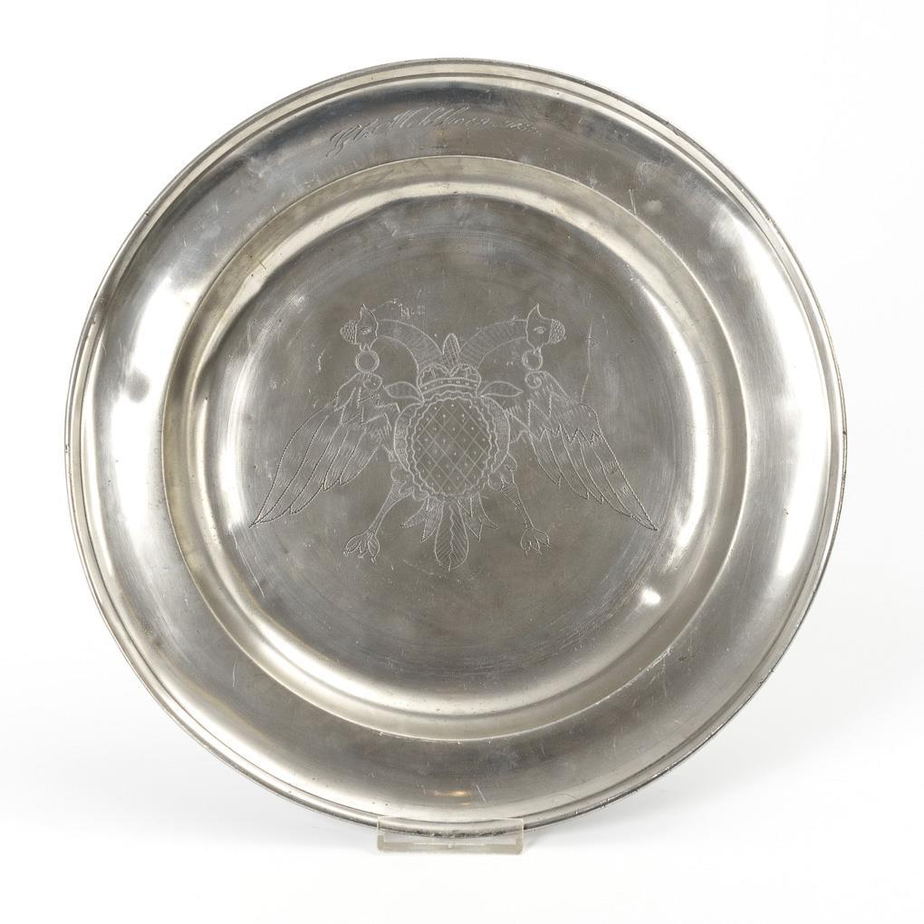 2 Schnabelstitzen mit Monogramm-Gravur, 1x mit Datum "1791". Zylinderkanne mit graviertem Schulterband und Eichhörnchenknauf. Platte mit geflecheltem Doppeladler und Gravur "G C: Mehlhorn 1852". 3 geschweifte Teller, davon 2 mit geflächeltem Motiv: "Die Reichsstadt Schw. Gmünd 1736" bzw. Kithara. Zylinderkanne mit Lötreparaturen und Dellen, sonst kaum Alters-/Gebrauchsspuren.