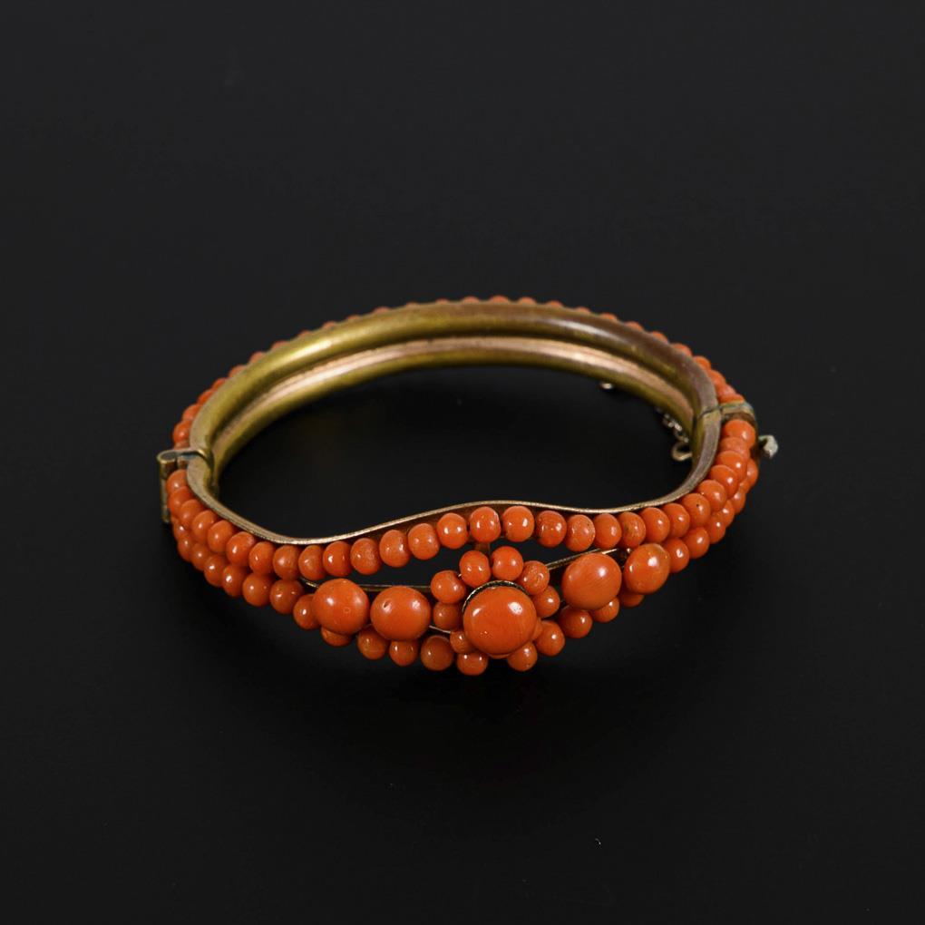 Klappreif mit aufgezogenen Korallenkugeln und montierten Korallenlinsen. Kastenschloss mit Sicherheitskette. Metall.