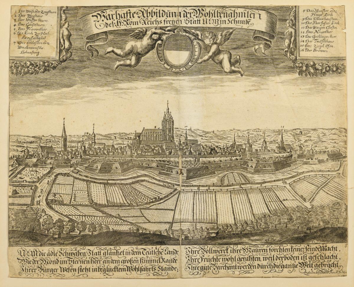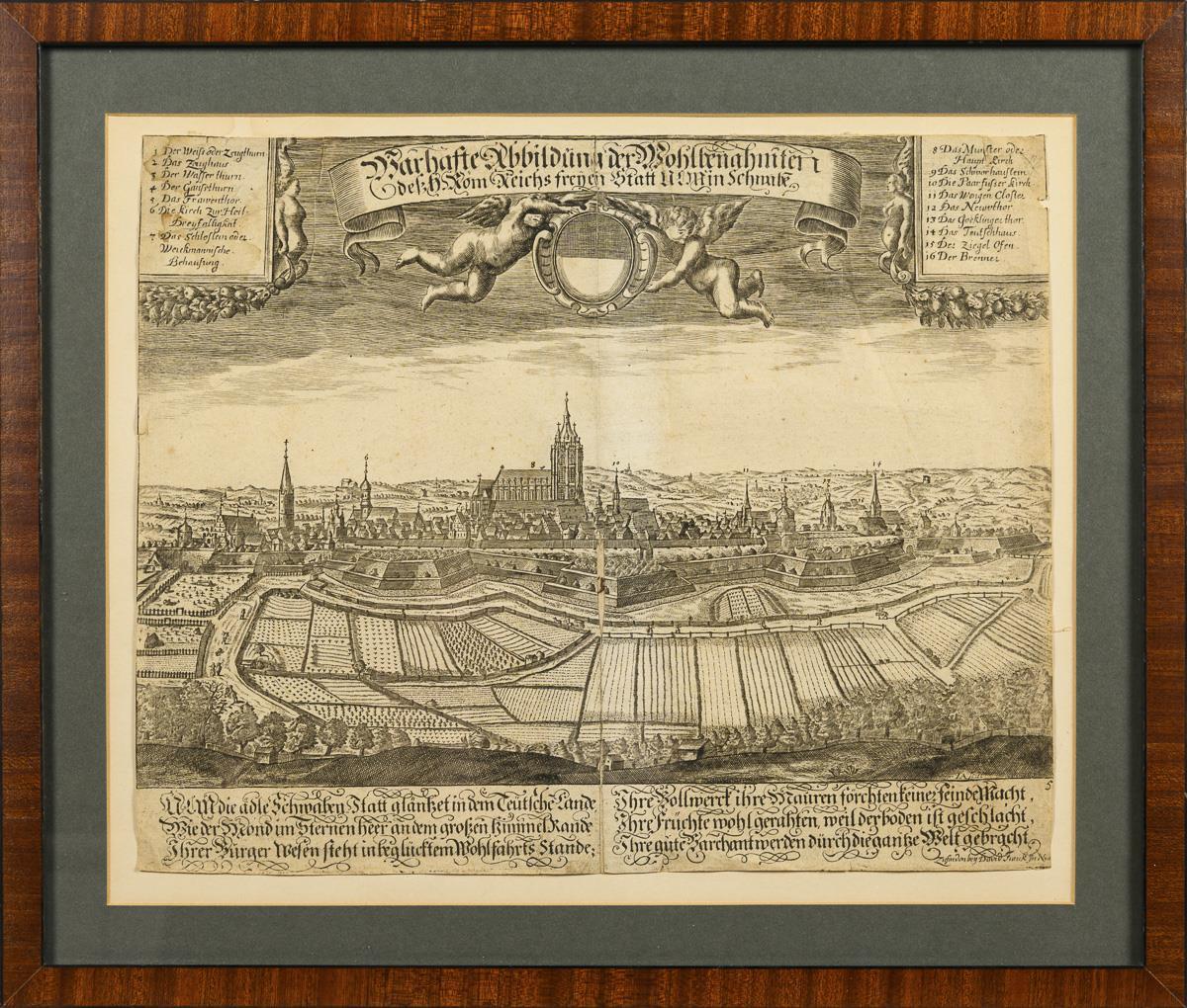 Historischer Blick auf die Stadt Ulm, mit Legende und Lobgedicht in deutscher Sprache, von Putten gestütztes Spruchband "Wahrhafte Abbildung der Wohlbenahmten des Röm. Reichs Freyen Statt Ulm in Schwaben", "zufinden bey David Funck in Nürnberg". Blatt beschnitten und zweiteilig, gebräunt und knickspurig.