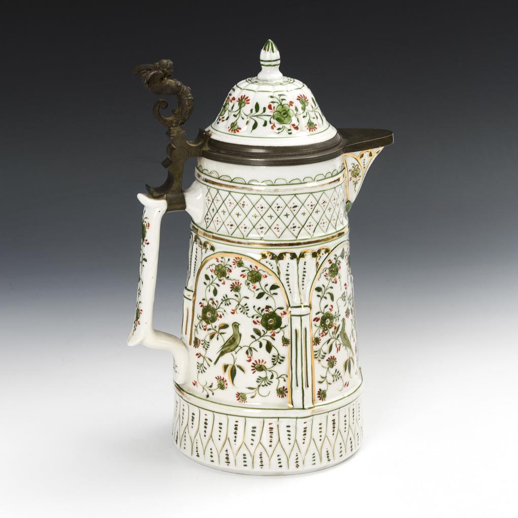 Unterglasurgrüne, rot- und goldgehöhte Malerei; Zinnmontierung mit geflügelter Frauenfigur als Drücker. H 29 cm.